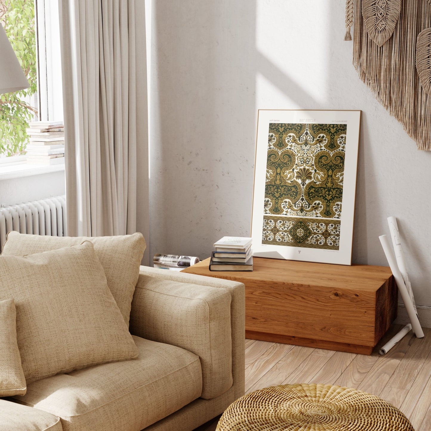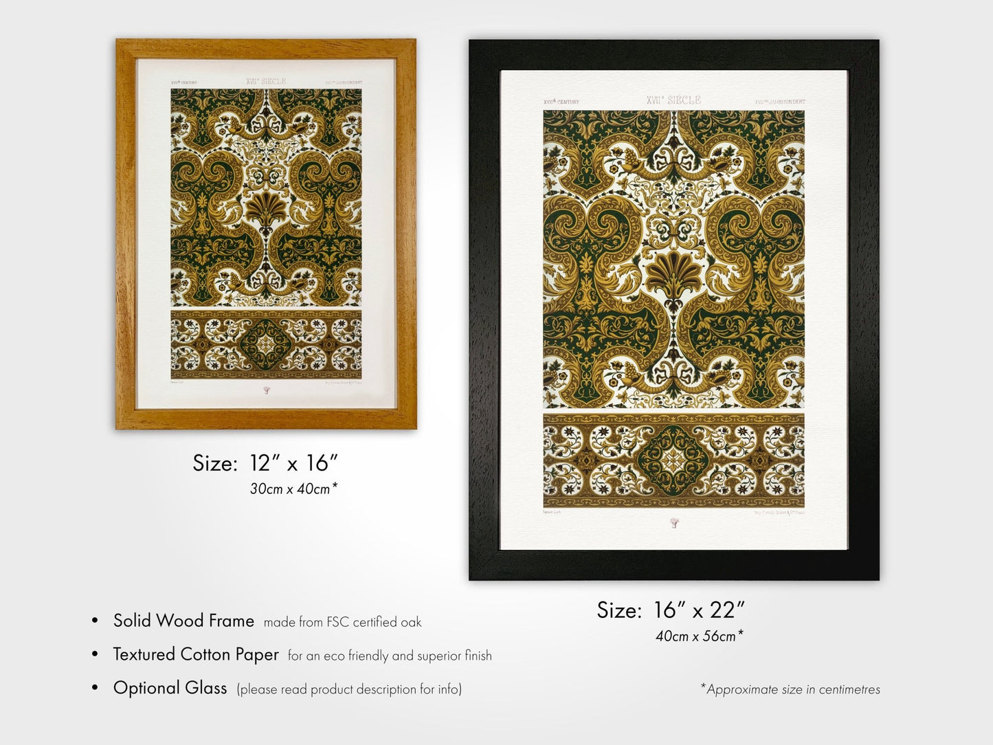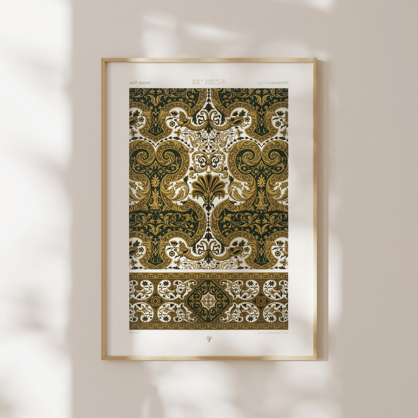 Ein Musterdruck aus dem 17. Jahrhundert aus einer Sammlung ornamentaler Teller namens „L’ornement Polychrome“ des französischen Künstlers Albert Racinet, erhältlich als hochwertiger Giclée-Kunstdruck mit einer großen Auswahl an Rahmenoptionen.