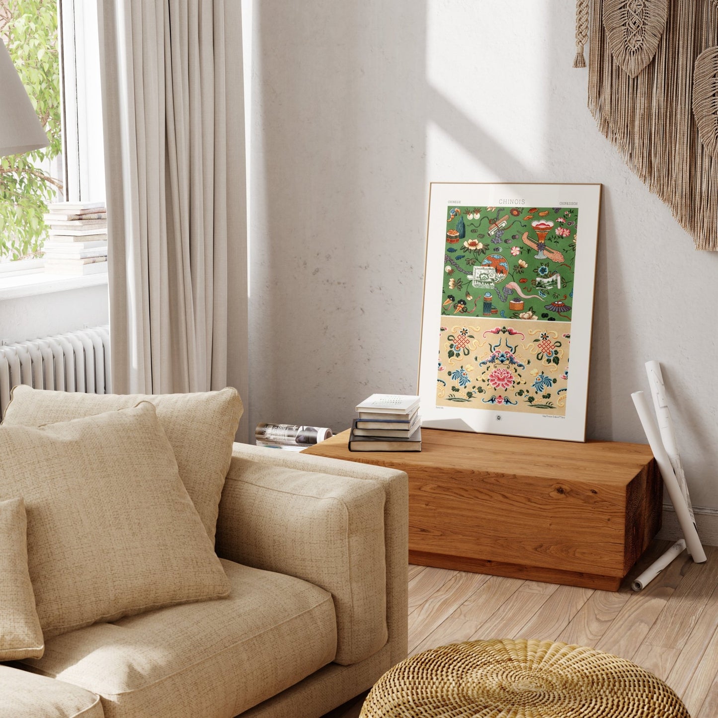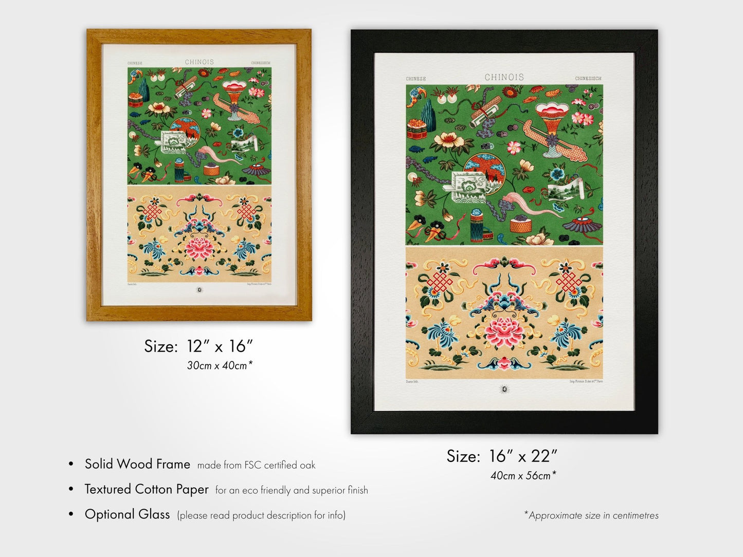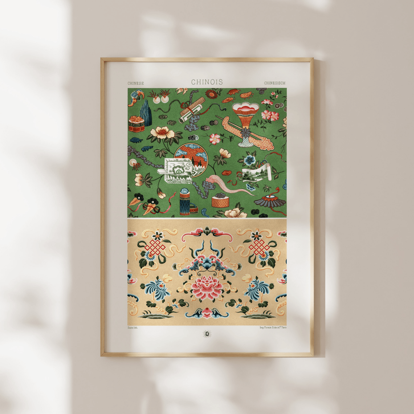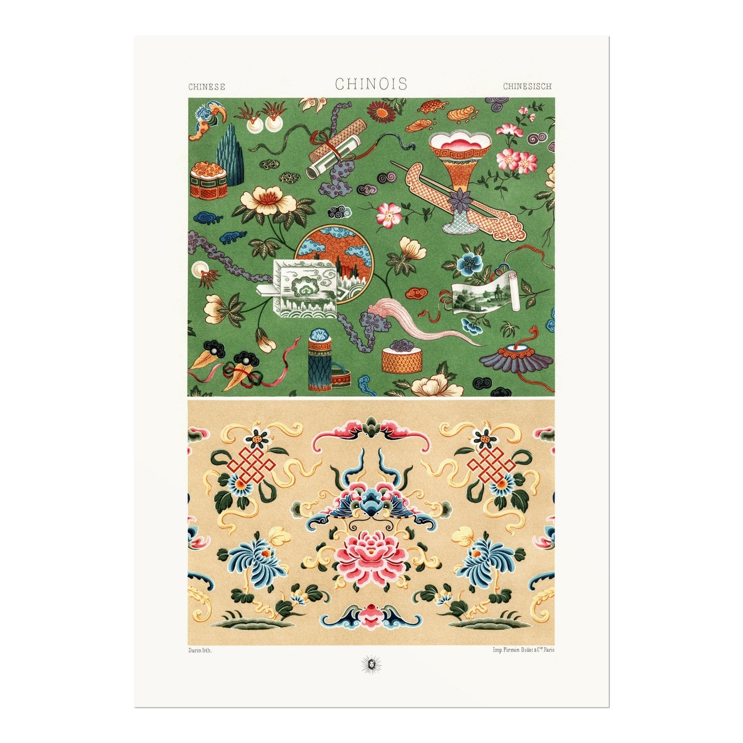 Ein Kunstdruck mit chinesischem Muster aus einer Sammlung ornamentaler Teller aus dem 19. Jahrhundert namens „L’ornement Polychrome“ des französischen Künstlers Albert Racinet, erhältlich als hochwertiger Giclée-Kunstdruck mit einer großen Auswahl an Rahmenoptionen.