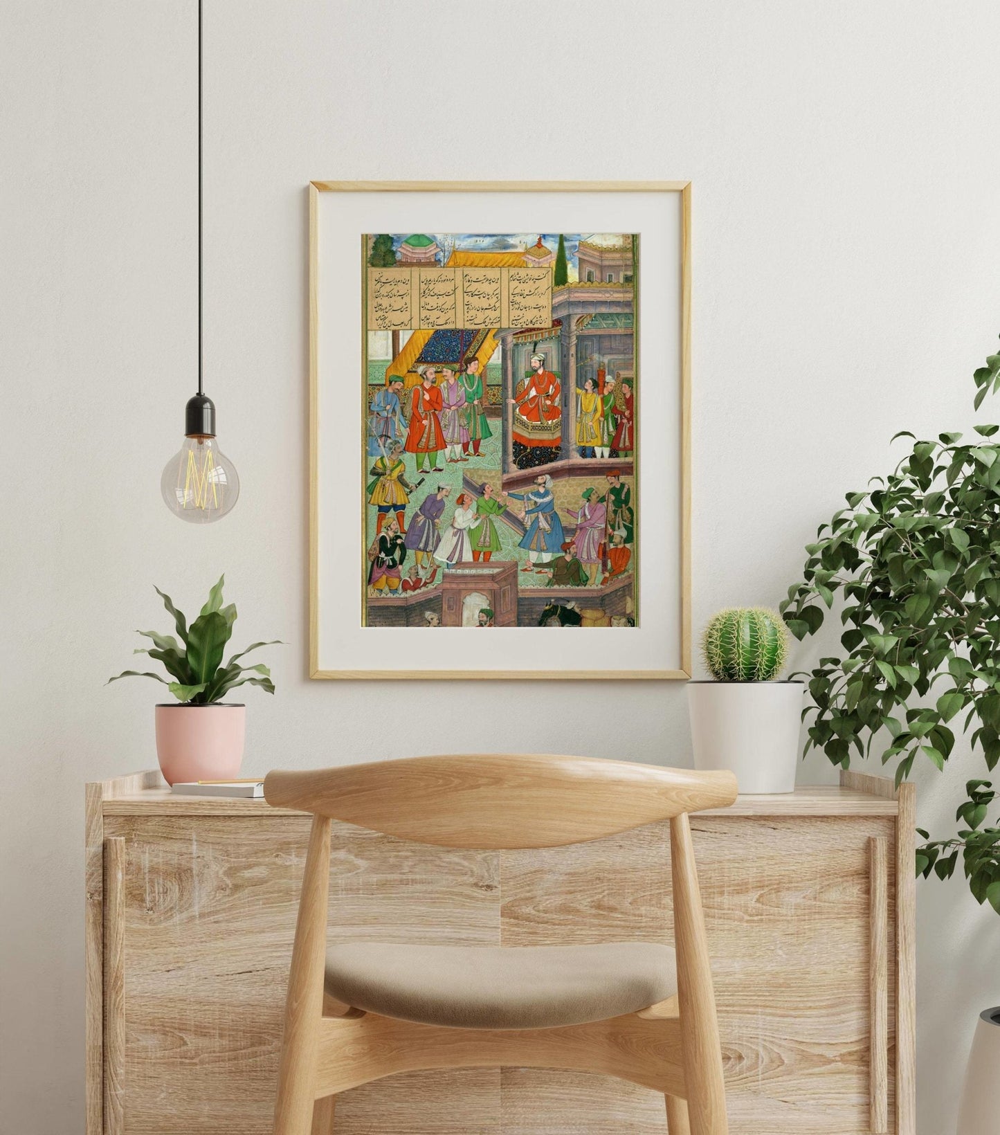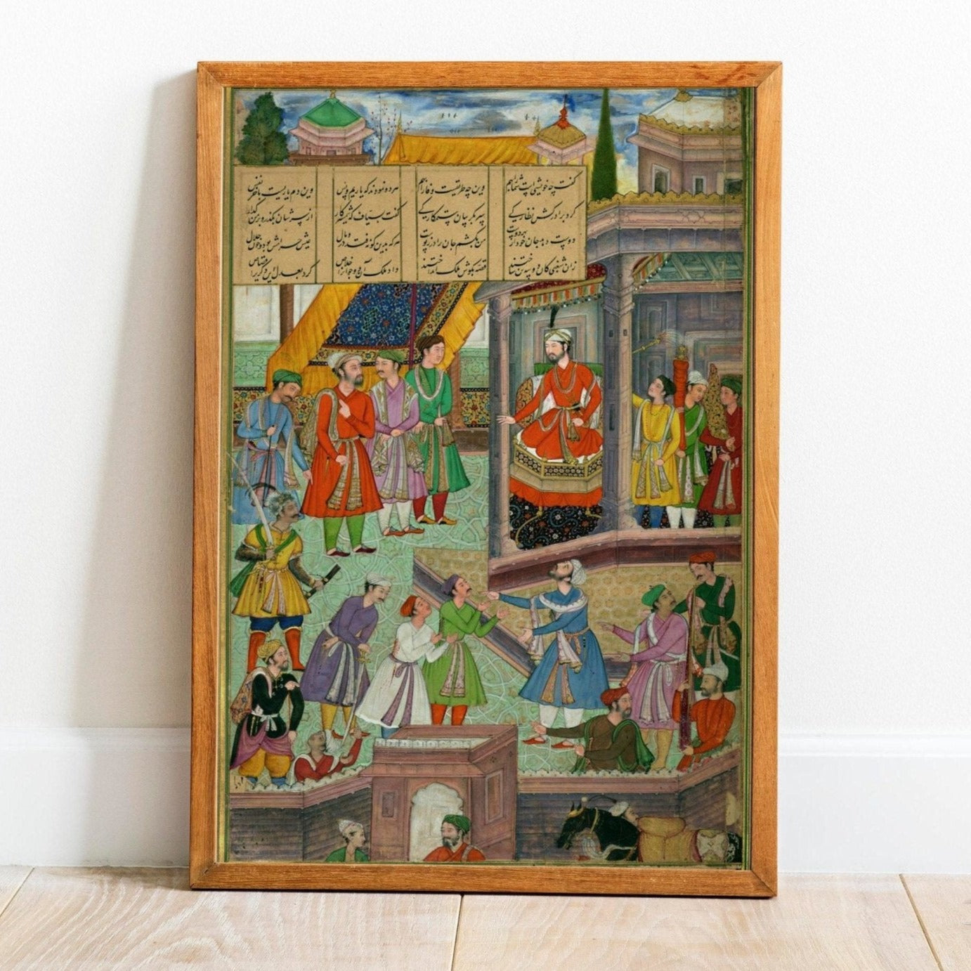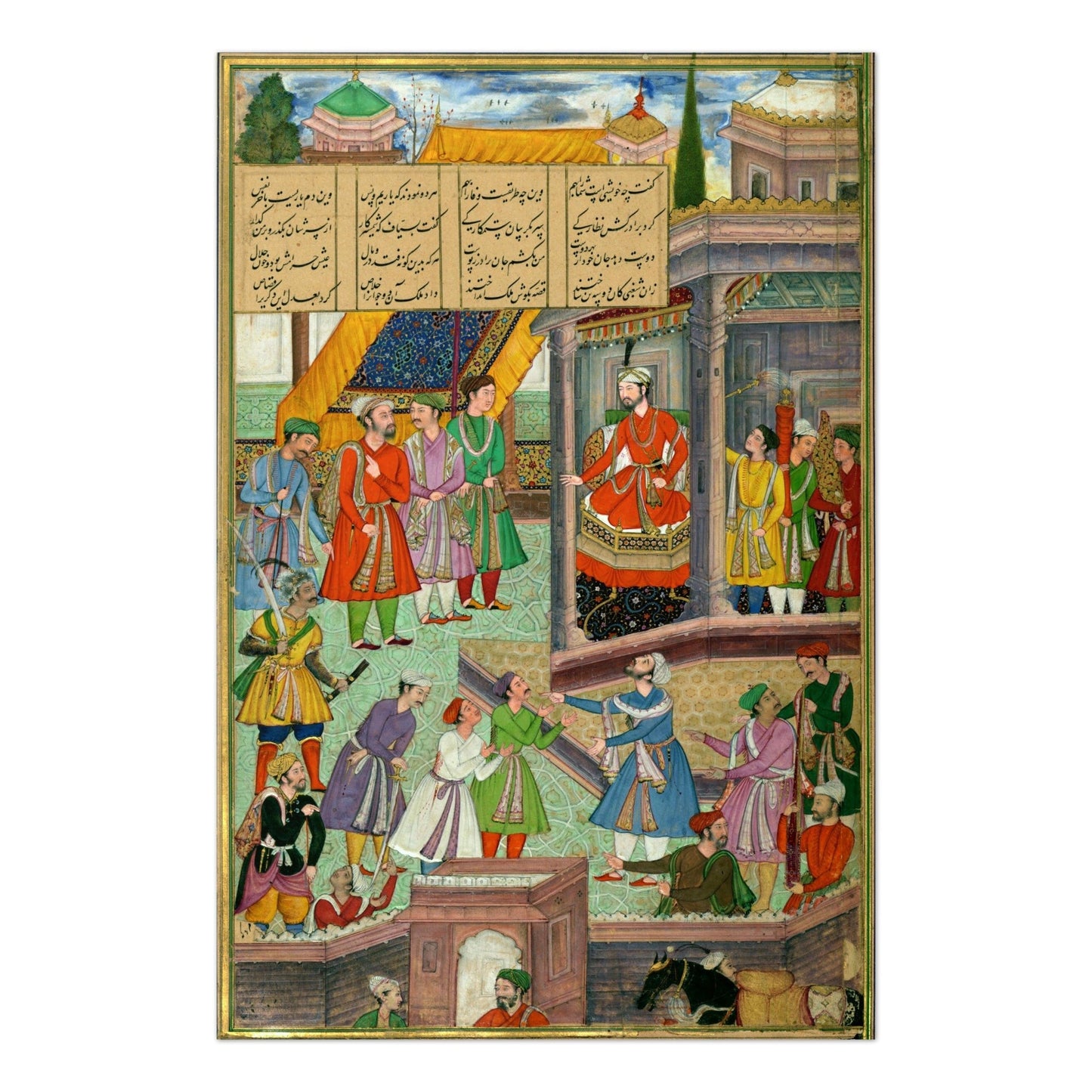 Ein traditionelles persisches Miniaturgemälde mit dem Titel „Brudermord zeugt von der Loyalität zweier Freunde“ von Amir Khusraw, das zwei Männer zeigt, die hingerichtet werden sollen, während mehrere Männer den König um Gnade bitten.