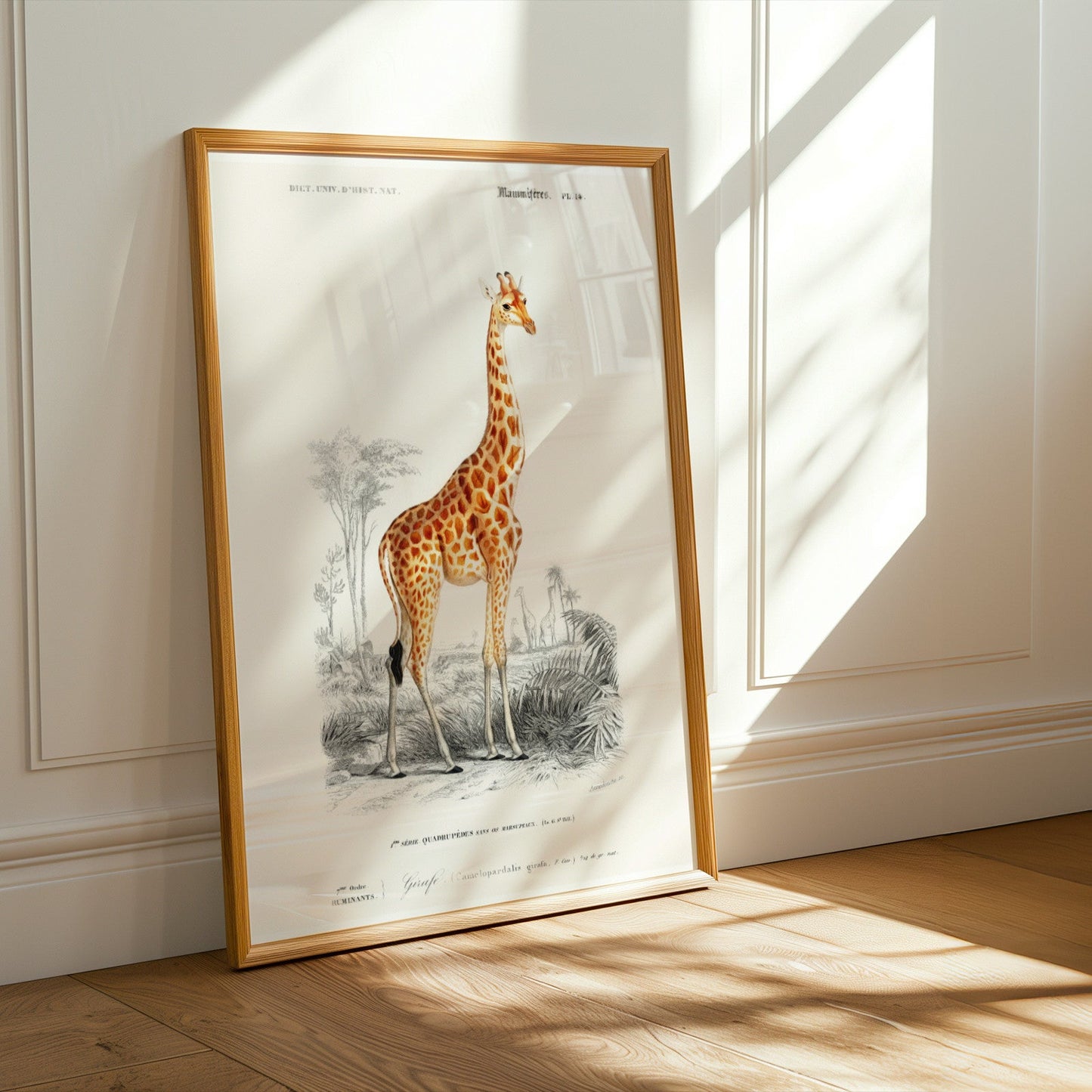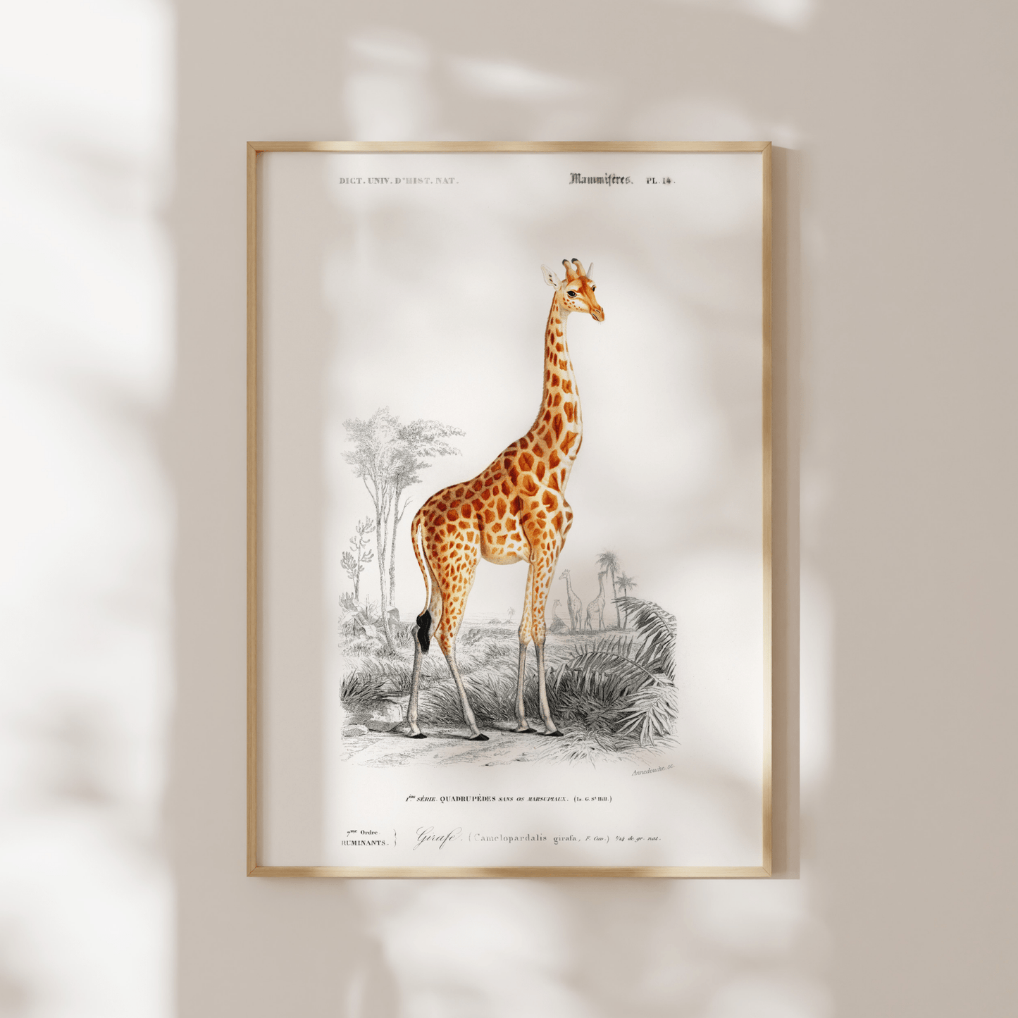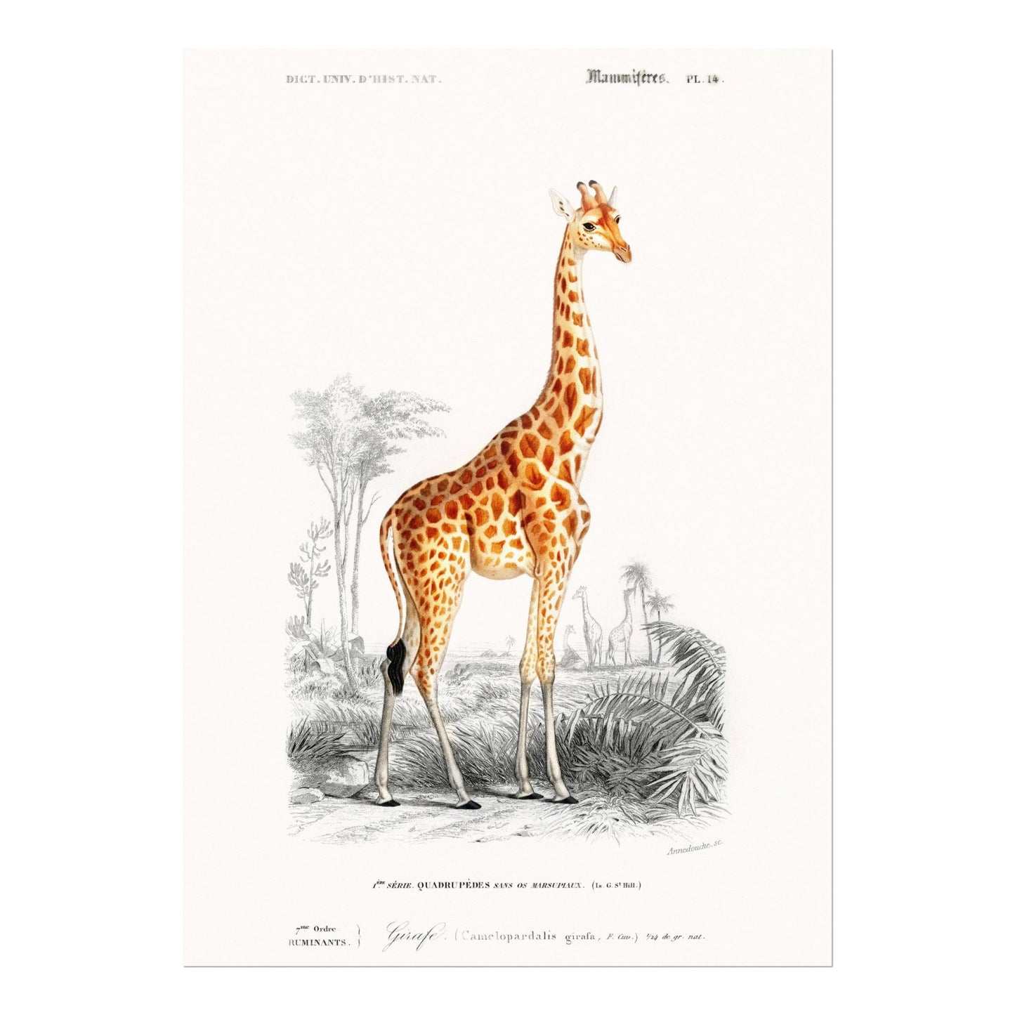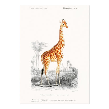 Eine Illustration einer Giraffe (Giraffa Camelopardalis) aus dem 19. Jahrhundert, abgebildet in der Ausgabe von „Dictionnaire Universel D'histoire Naturelle“ von Charles Dessalines D'Orbigny aus dem Jahr 1892, erhältlich als hochauflösender Druck in verschiedenen maßgeschneiderten Größen.