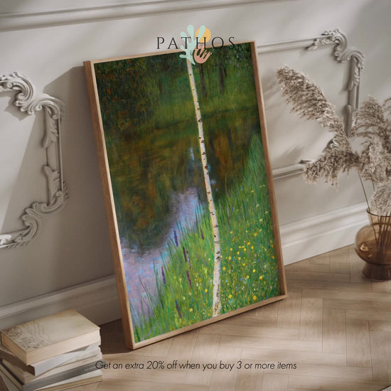 Gustav Klimts klassische Öl-auf-Leinwand-Gemälde mit dem Titel „Seeufer mit Birken“, erhältlich als Premium-Giclée-Druck und mit verschiedenen Rahmenoptionen.