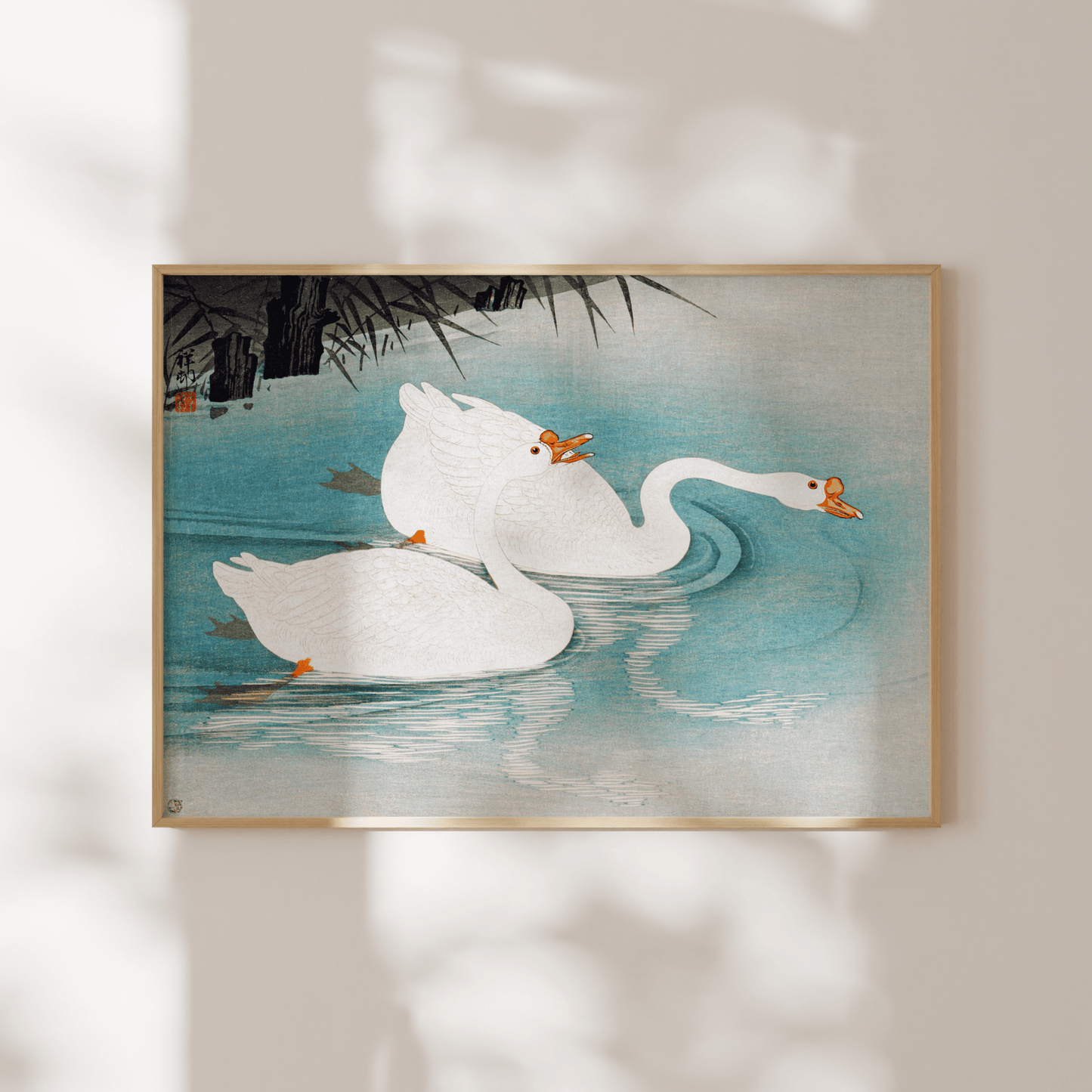 Ohara Kosons klassisches japanisches Holzschnittgemälde „Geese Amid Reeds“, erhältlich als hochwertiger Giclée-Kunstdruck mit einer breiten Palette an Rahmenoptionen.