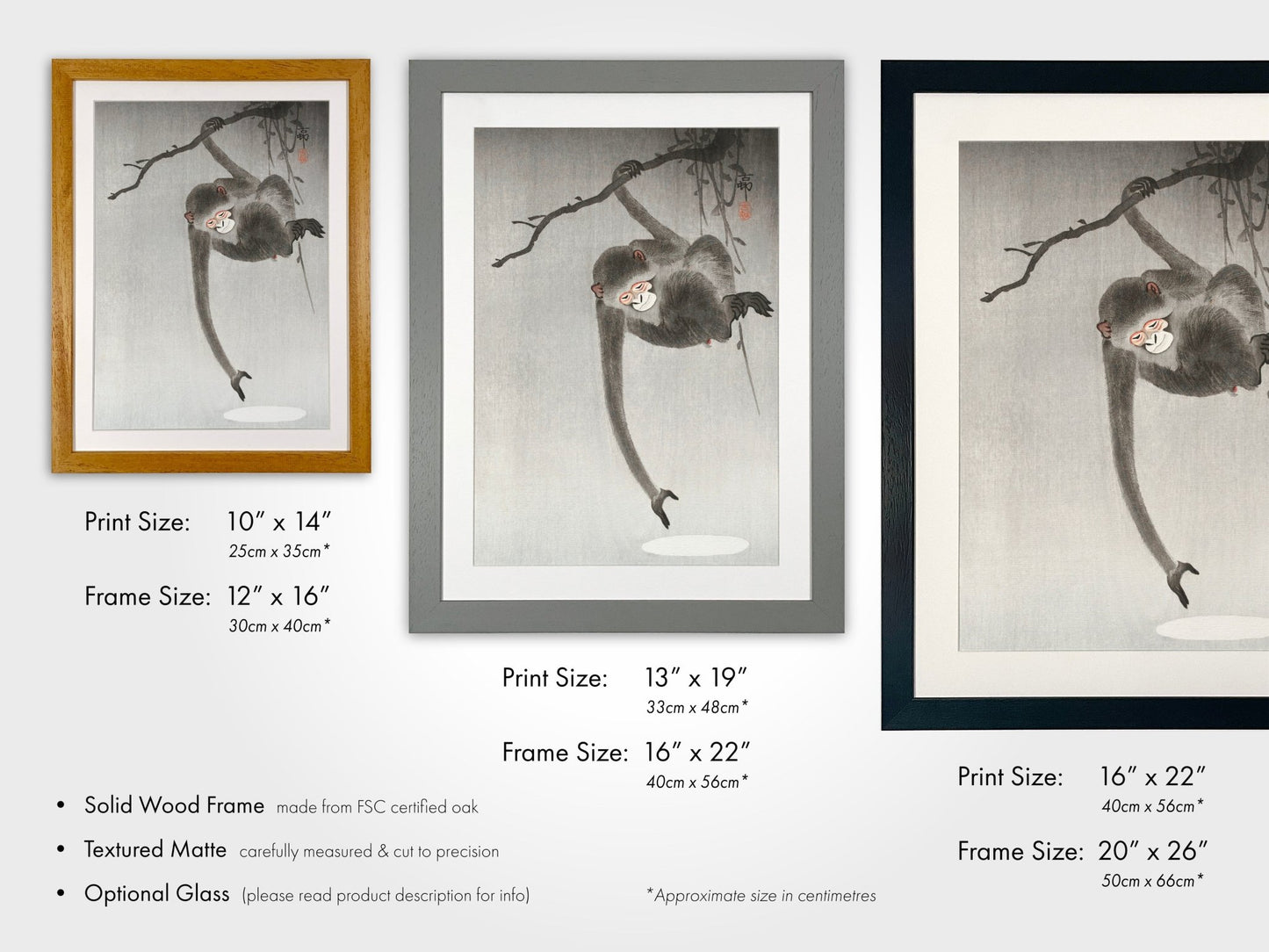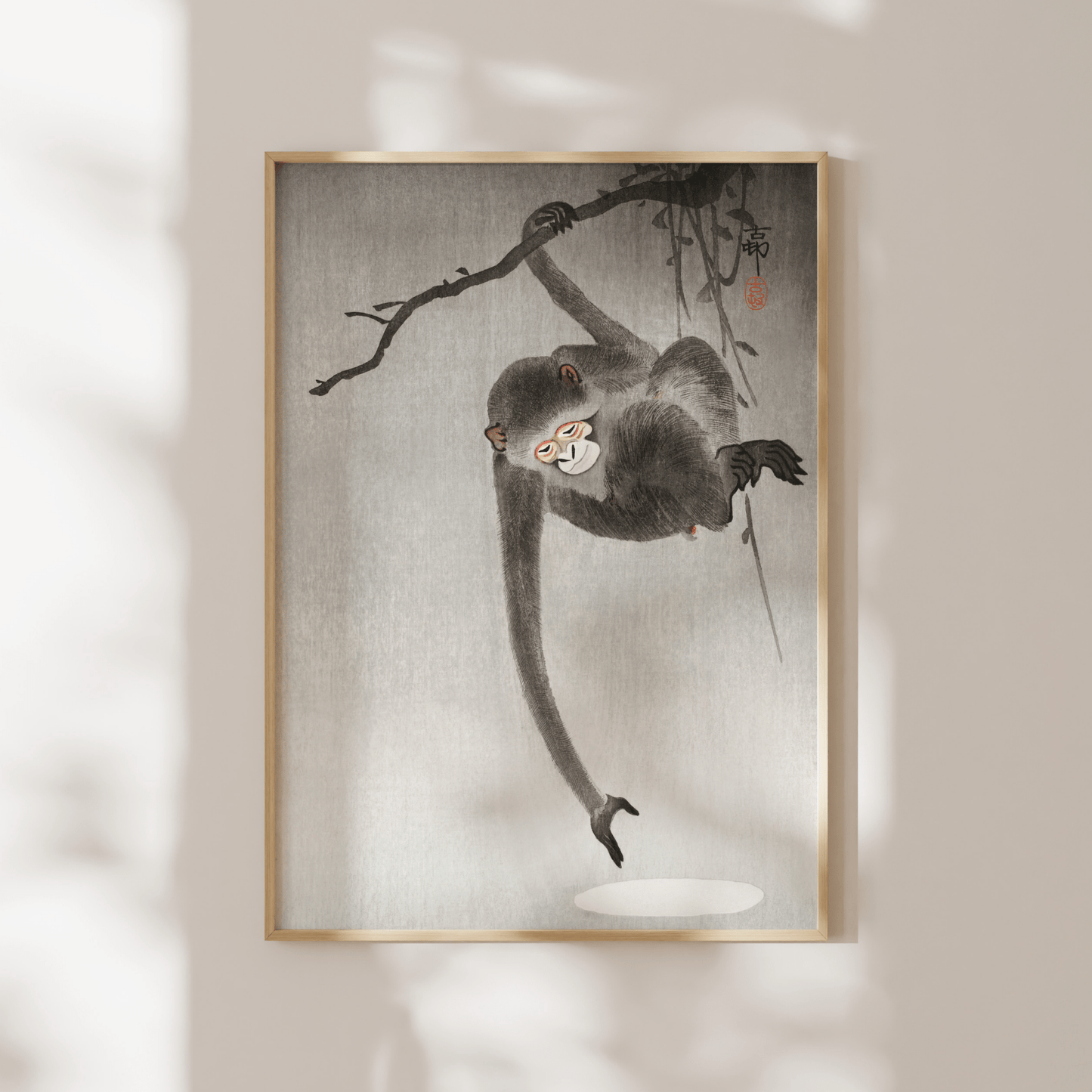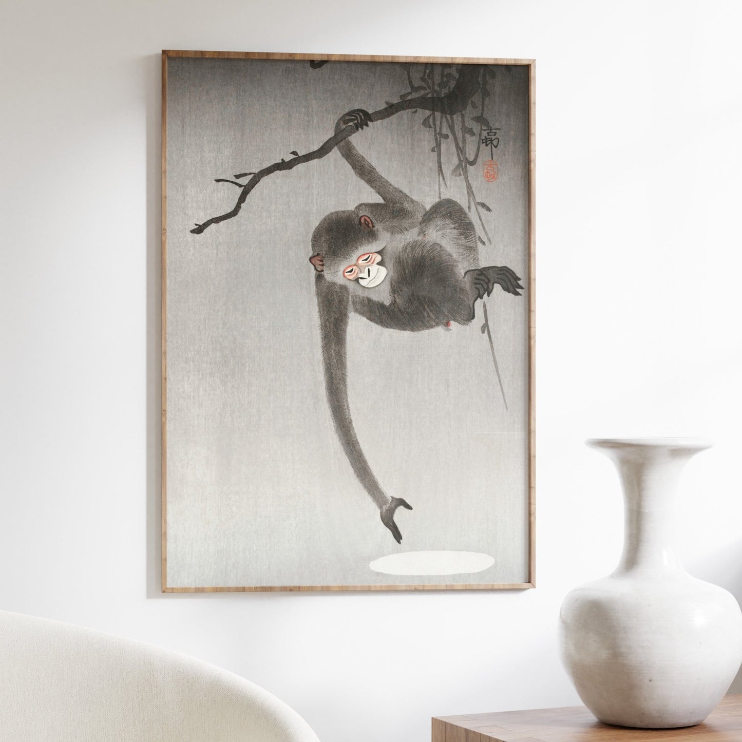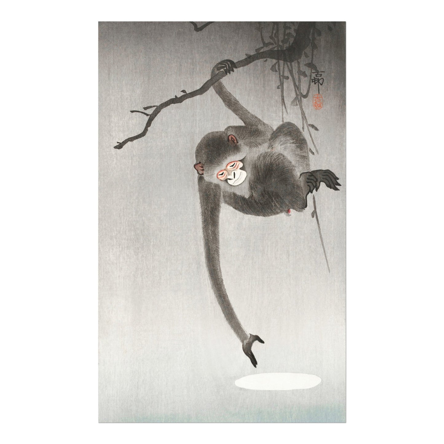 Ohara Kosons klassische Holzschnittillustration „Affe und Spiegelung des Mondes“ aus dem 20. Jahrhundert, erhältlich als hochwertiger Giclée-Kunstdruck mit einer breiten Palette an Rahmenoptionen.