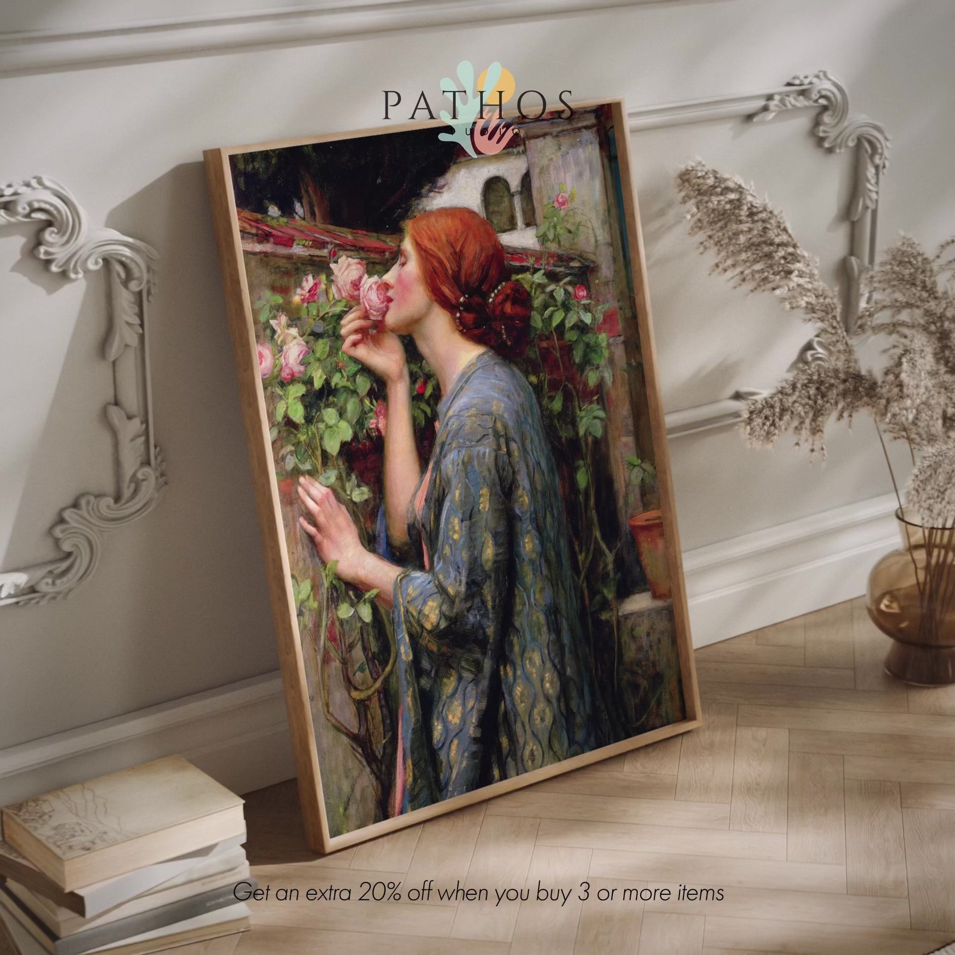 Painted in 1908, this evocative Pre-Raphaelite work is celebrated for its romantic subject matter, delicate detailing, and rich colour harmonies, depicting a young woman immersed in the fragrance of a rose, a theme that reflects Waterhouse’s enduring fascination with beauty, myth, and poetic symbolism.