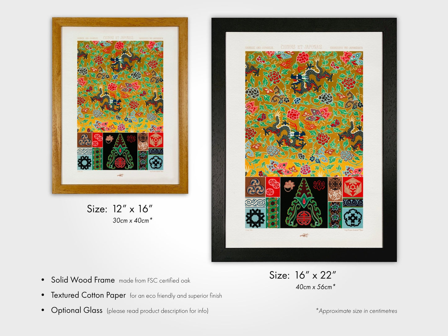 Tous les produits imprimés sont fabriqués exclusivement avec des encres végétaliennes et nous utilisons uniquement du chêne certifié FSC pour nos cadres en bois.