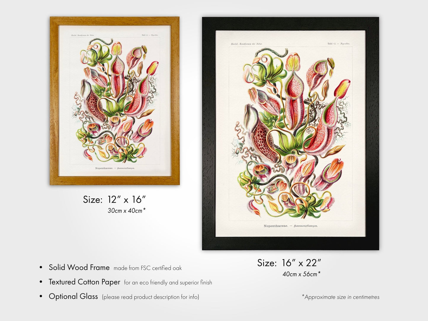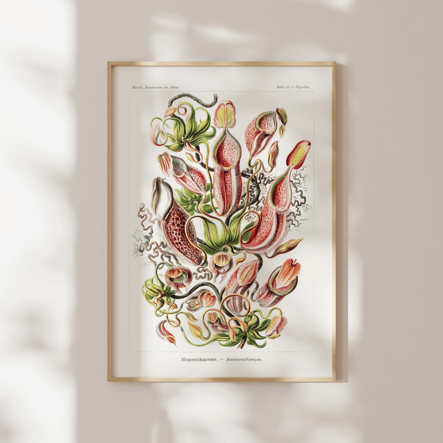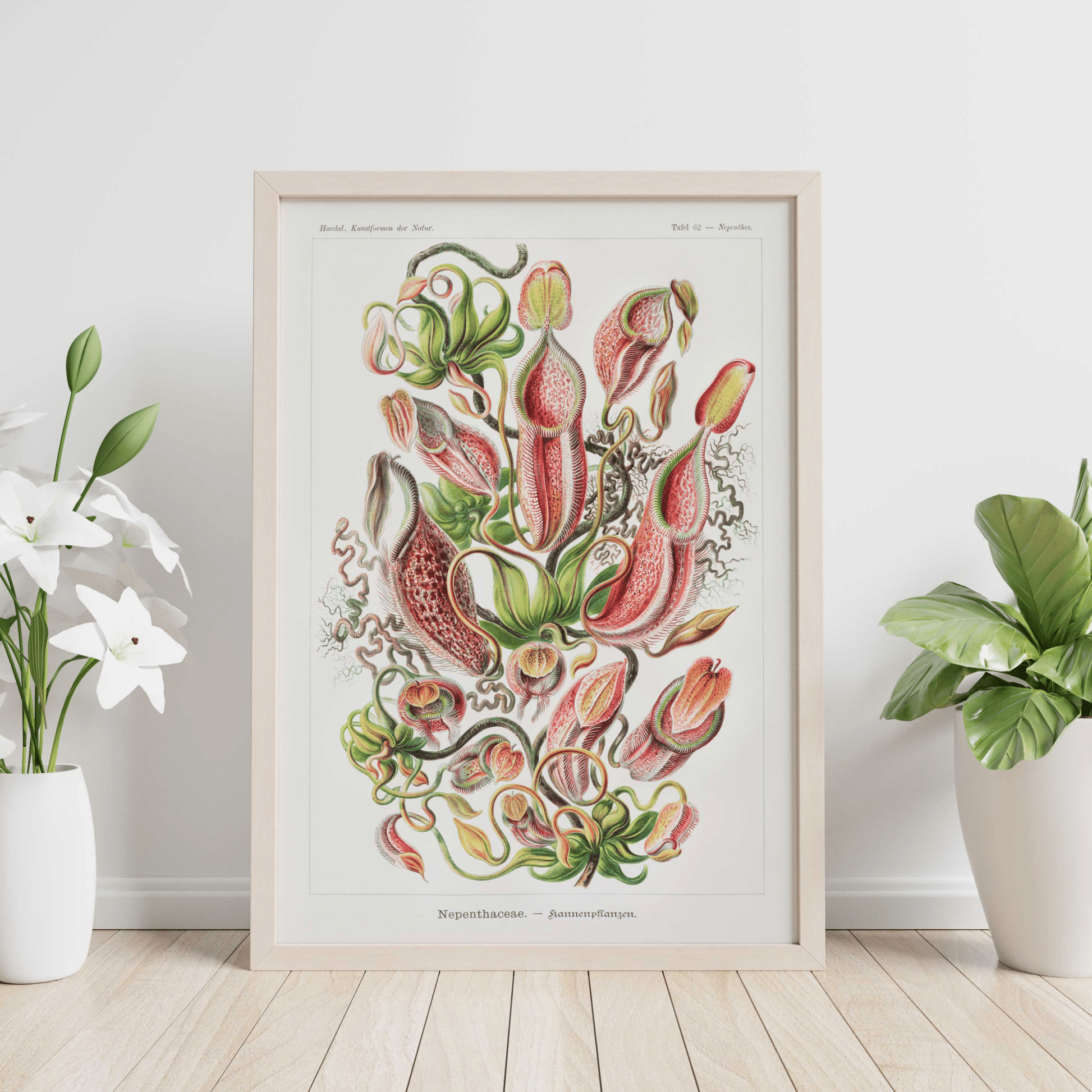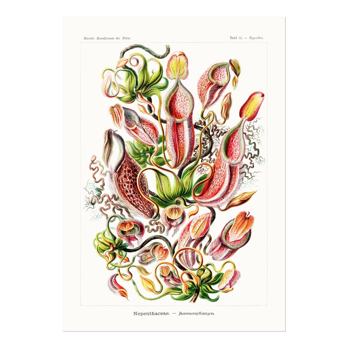 Une lithographie du début du XXe siècle de Nepenthaceae présentée dans "Kunstformen Der Natur" par le célèbre naturaliste et zoologiste allemand Ernst Haeckel, disponible en impression haute résolution dans une variété de tailles sur mesure.
