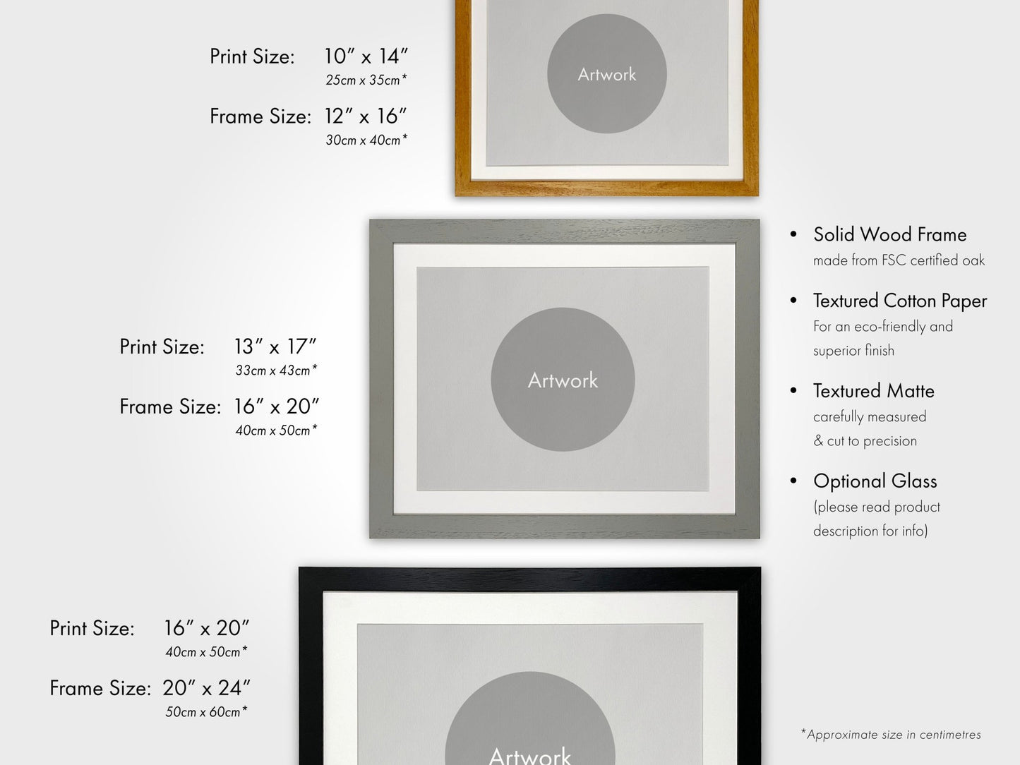 Tous nos produits encadrés incluent notre papier d'art en coton texturé en raison de ses propriétés d'archivage et de sa résistance aux éraflures et aux empreintes digitales. Cela signifie que l'œuvre peut être présentée "exposée" et sans glaçure pour un aspect optimal.