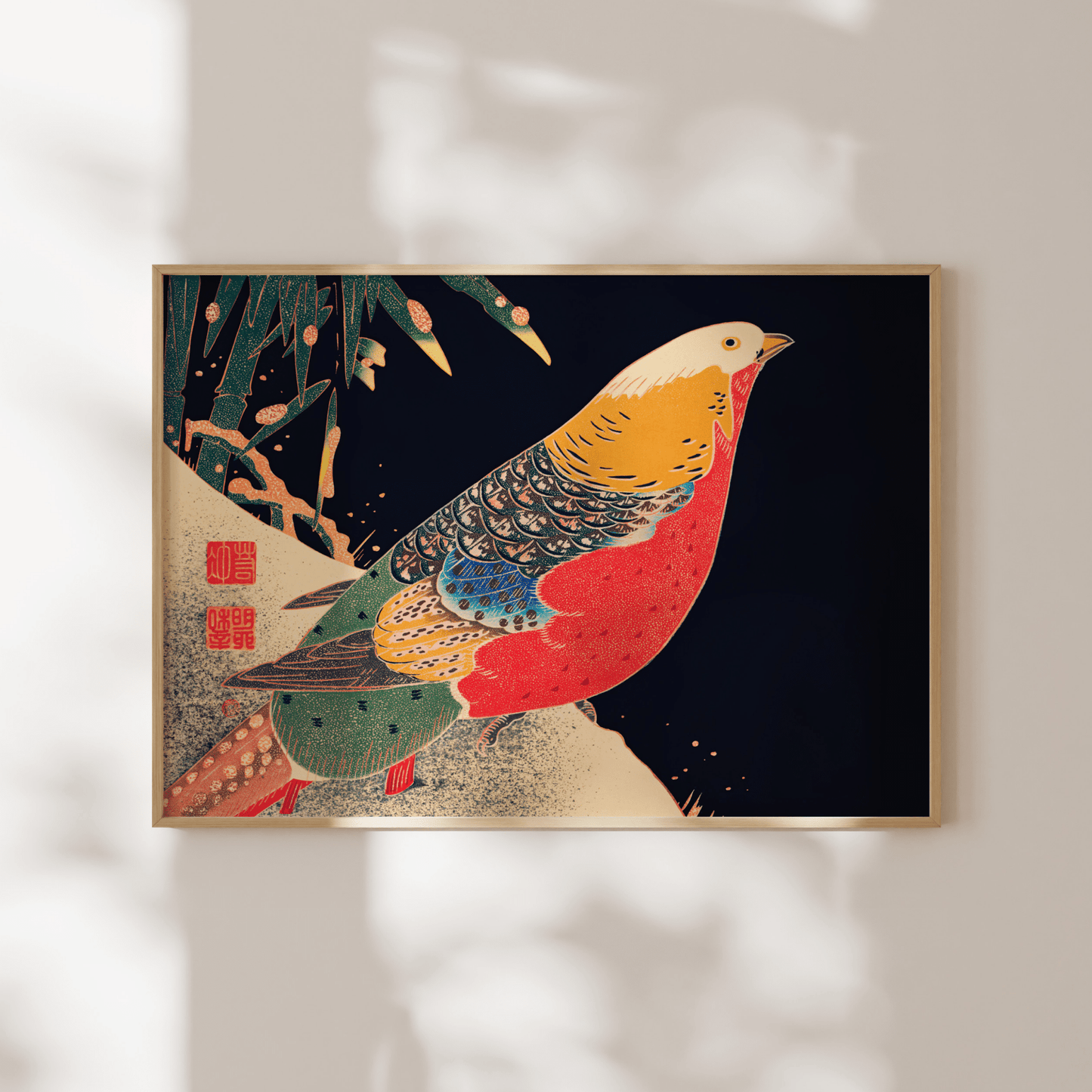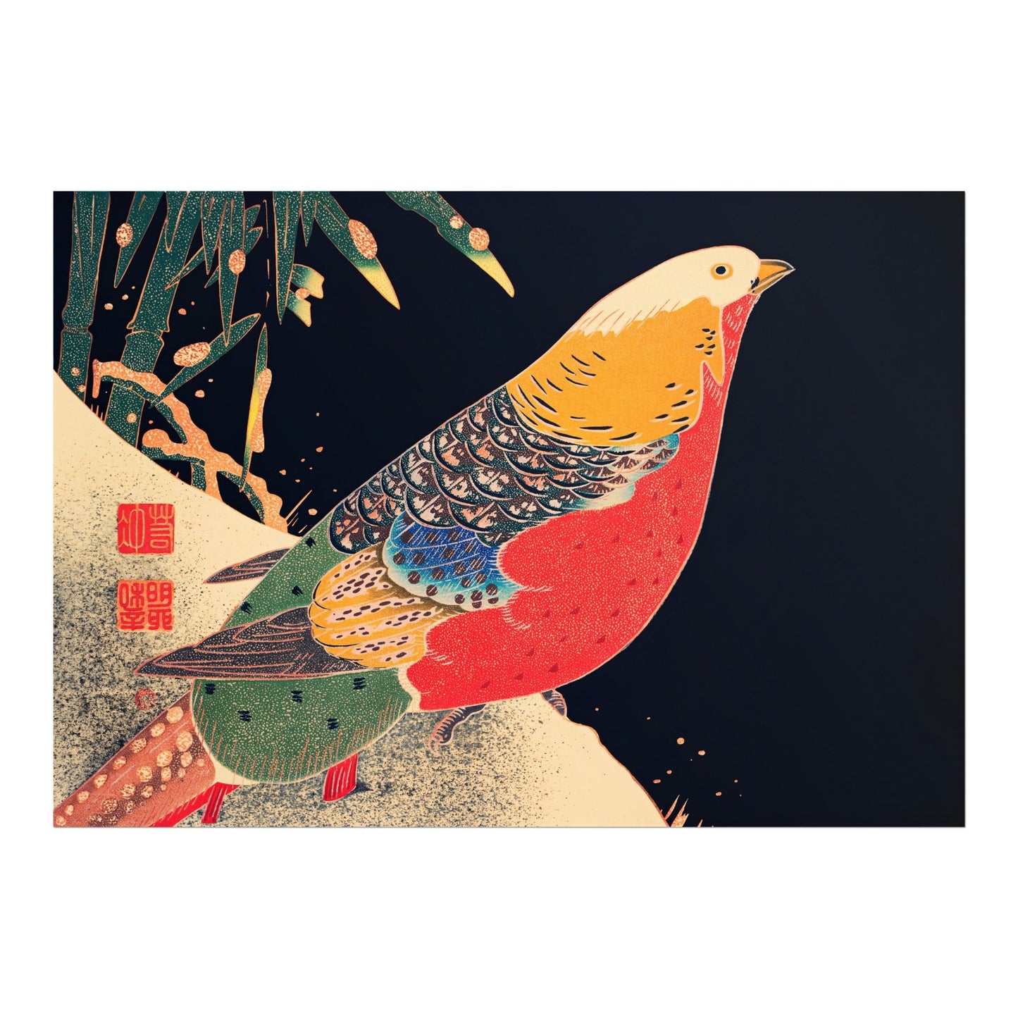 L'illustration classique de la gravure sur bois du 20e siècle d'Ito Jakuchu "Golden Pheasant in the Snow", disponible sur commande en tant qu'impression d'art giclée premium avec une large gamme d'options de cadrage.