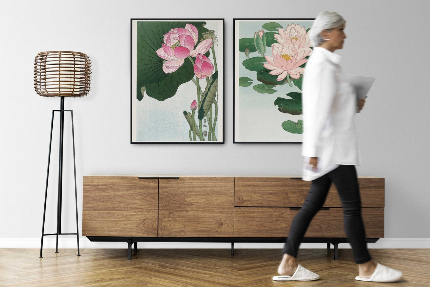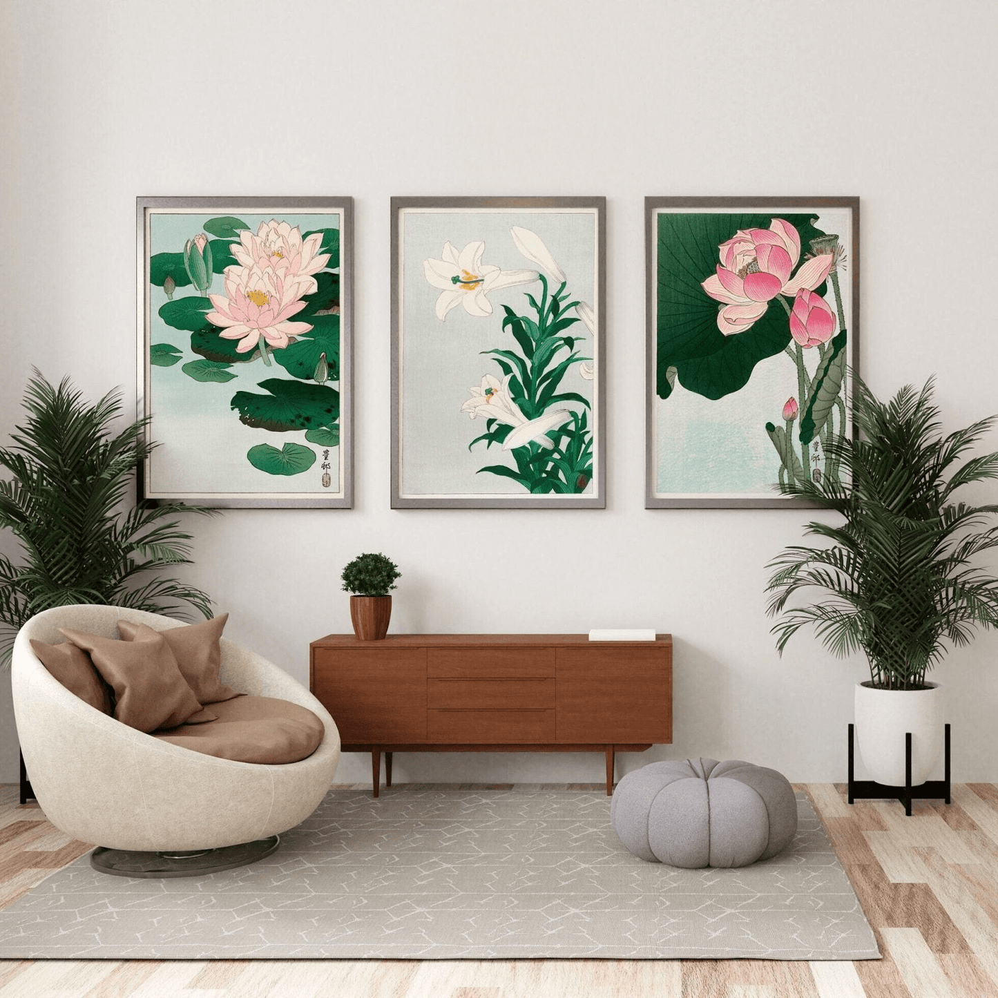 Cet ensemble particulier comprend 3 gravures sur bois japonaises d'Ohara Koson intitulées « Water Lily », « Blooming Lotus Flowers » et « Lilies ».