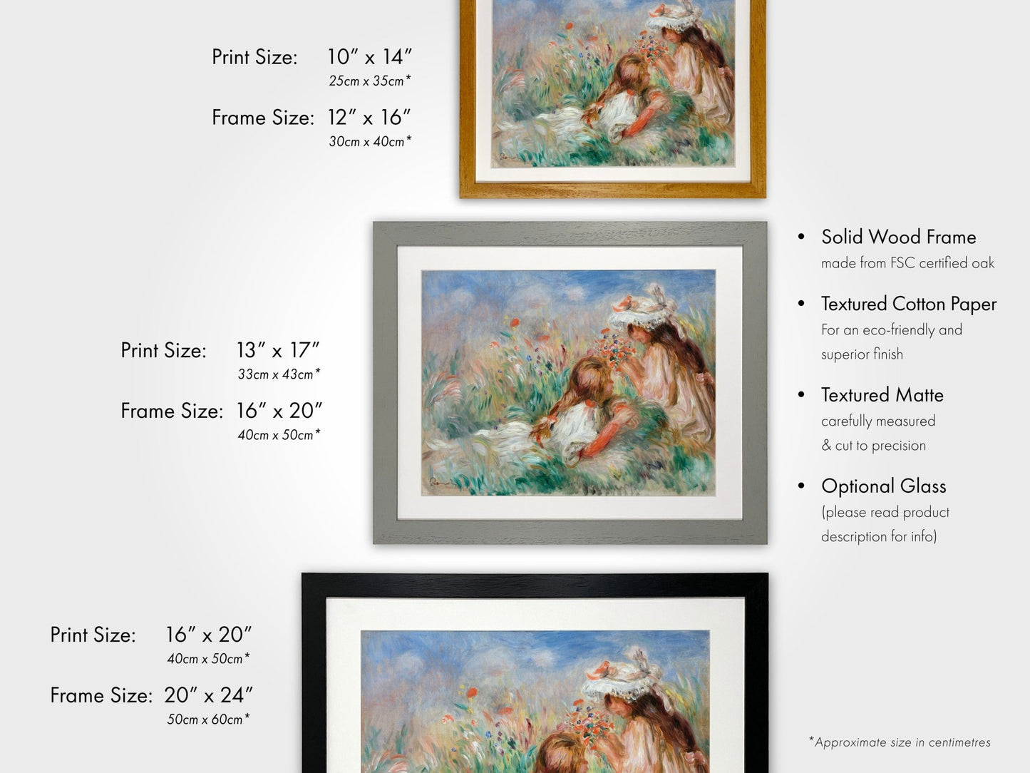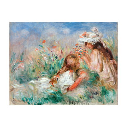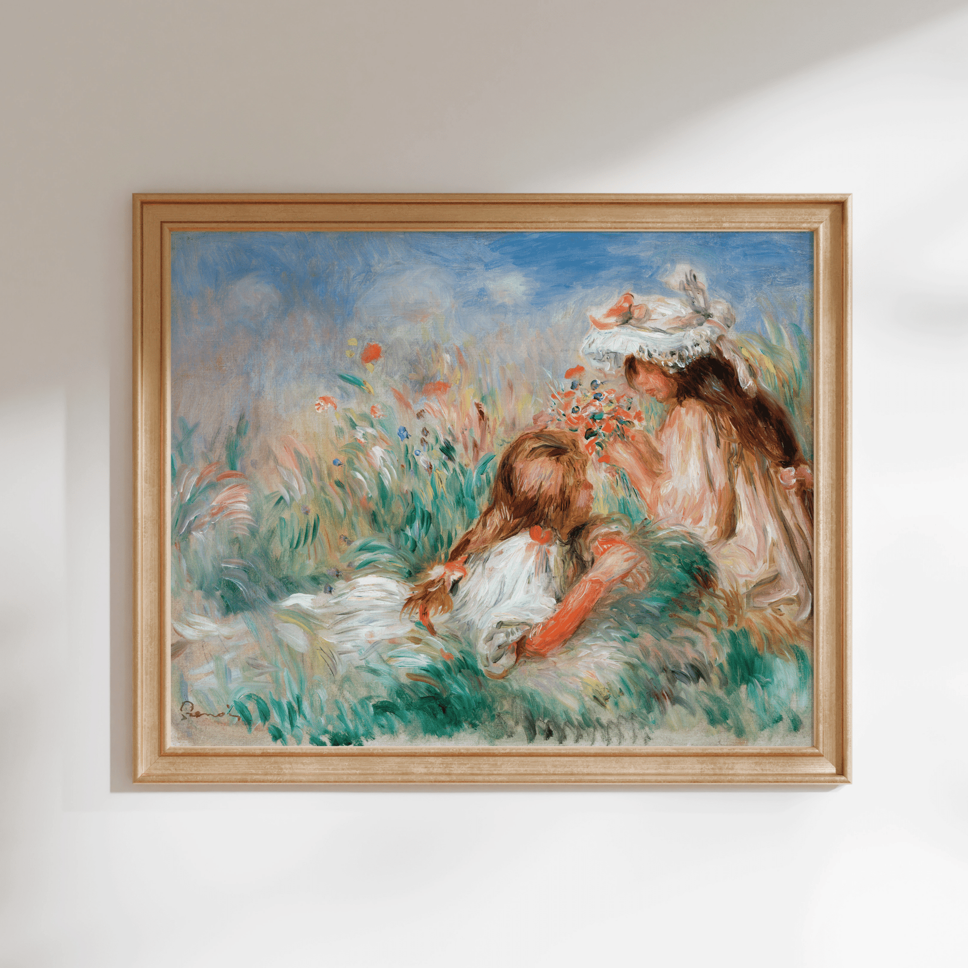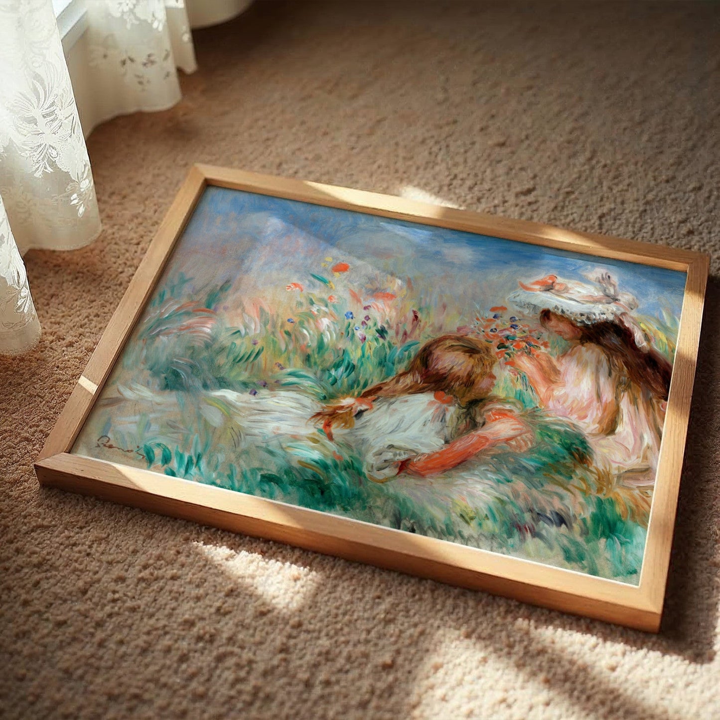 Peinture à l'huile sur toile classique de Pierre-Auguste Renoir « Filles dans l'herbe arrangeant un bouquet », disponible en impression giclée haute résolution dans une variété de tailles.