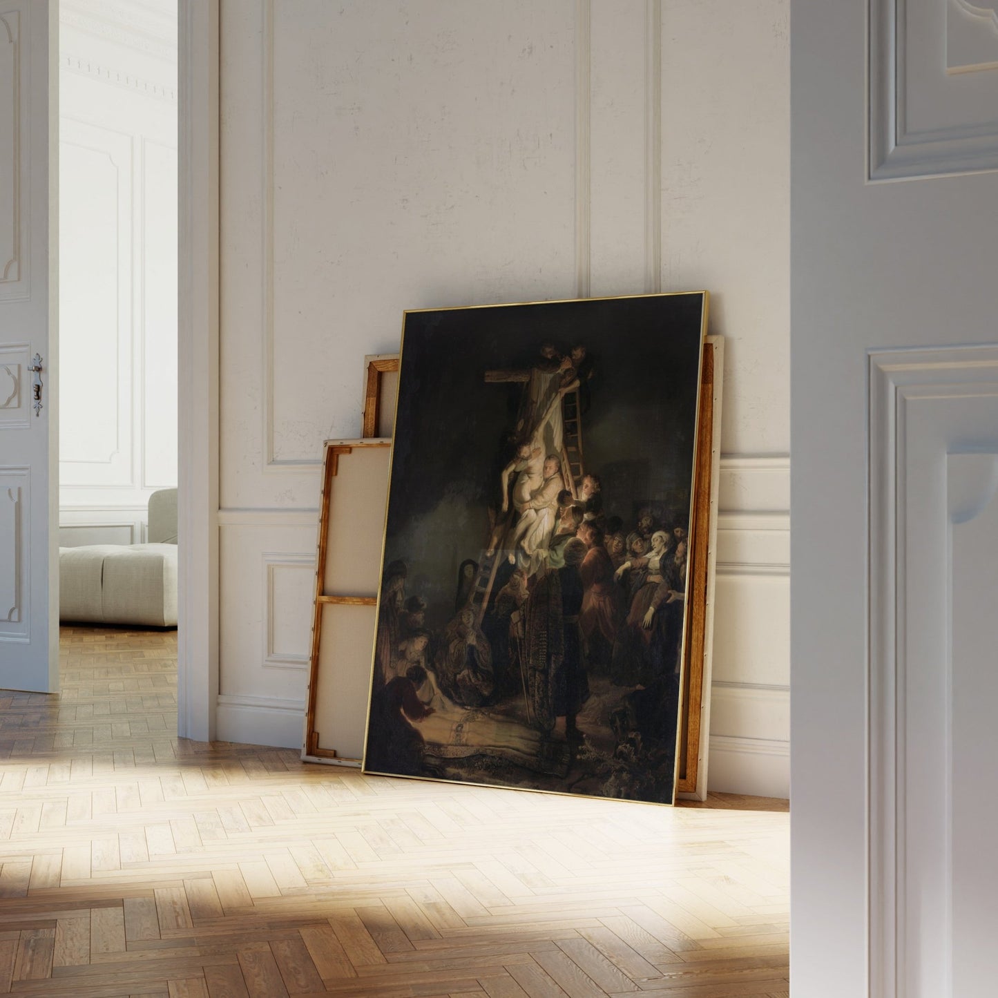 La peinture à l'huile sur toile classique de Rembrandt van Rijn intitulée "La descente de la croix", disponible sur commande en tant qu'impression d'art giclée premium avec une large gamme d'options de cadrage.
