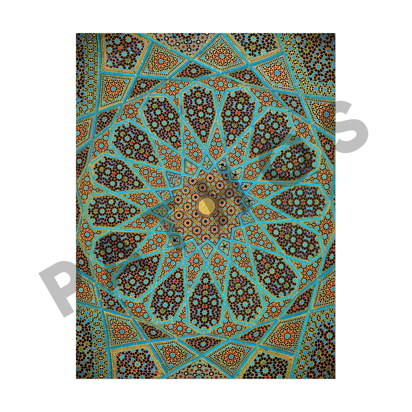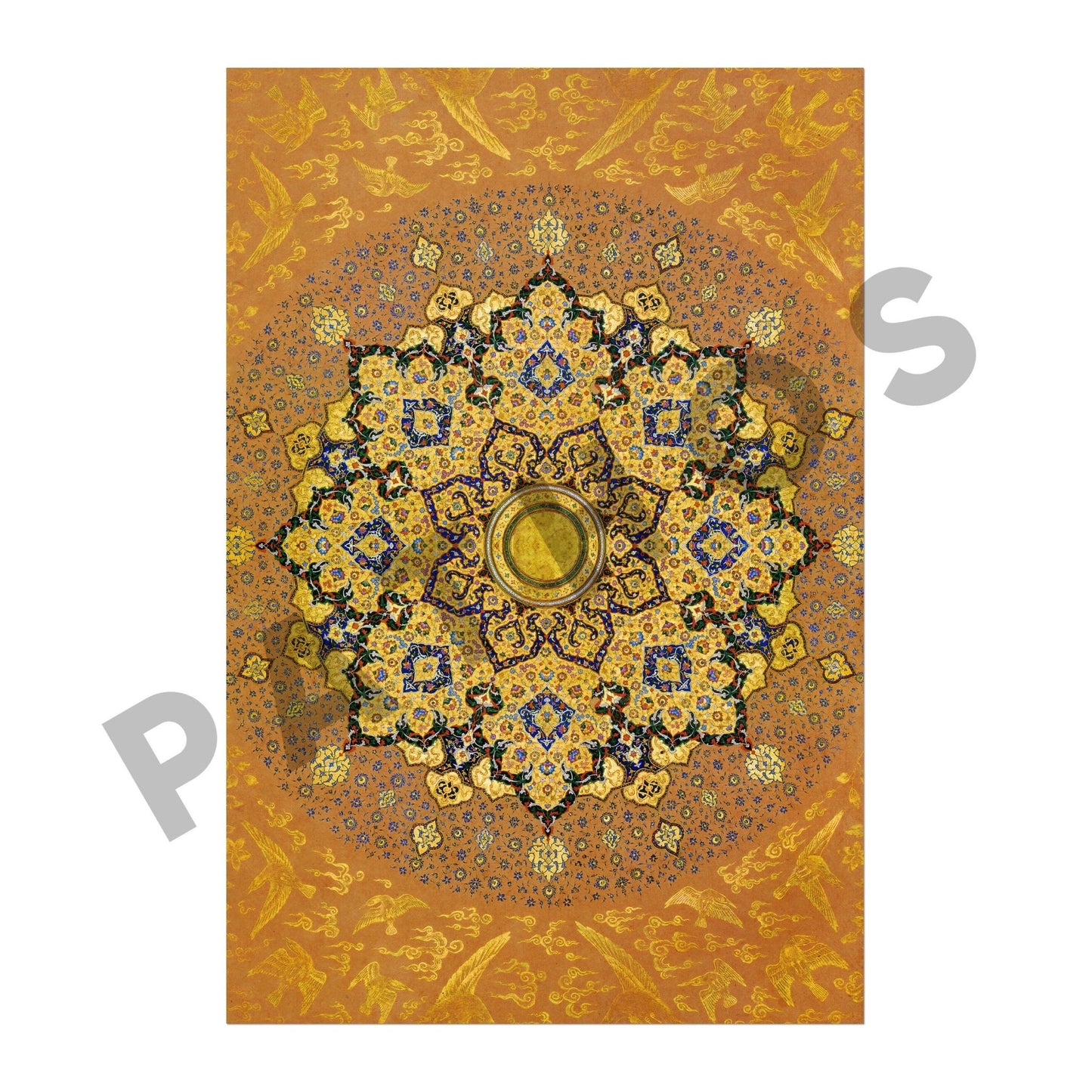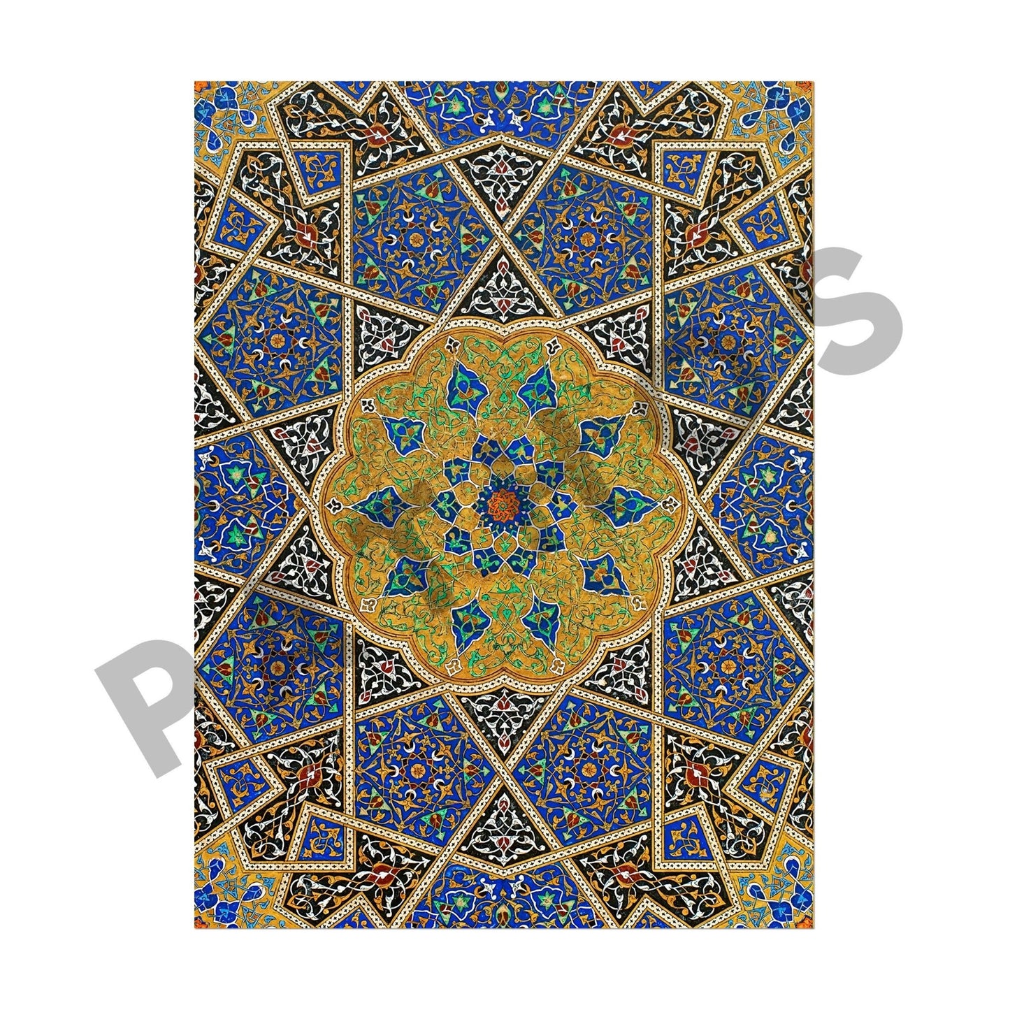 Cet ensemble particulier comprend une impression couleur or du « Plafond du tombeau de Hafez », ainsi que deux motifs Shamse tirés d'un Coran illustré.
