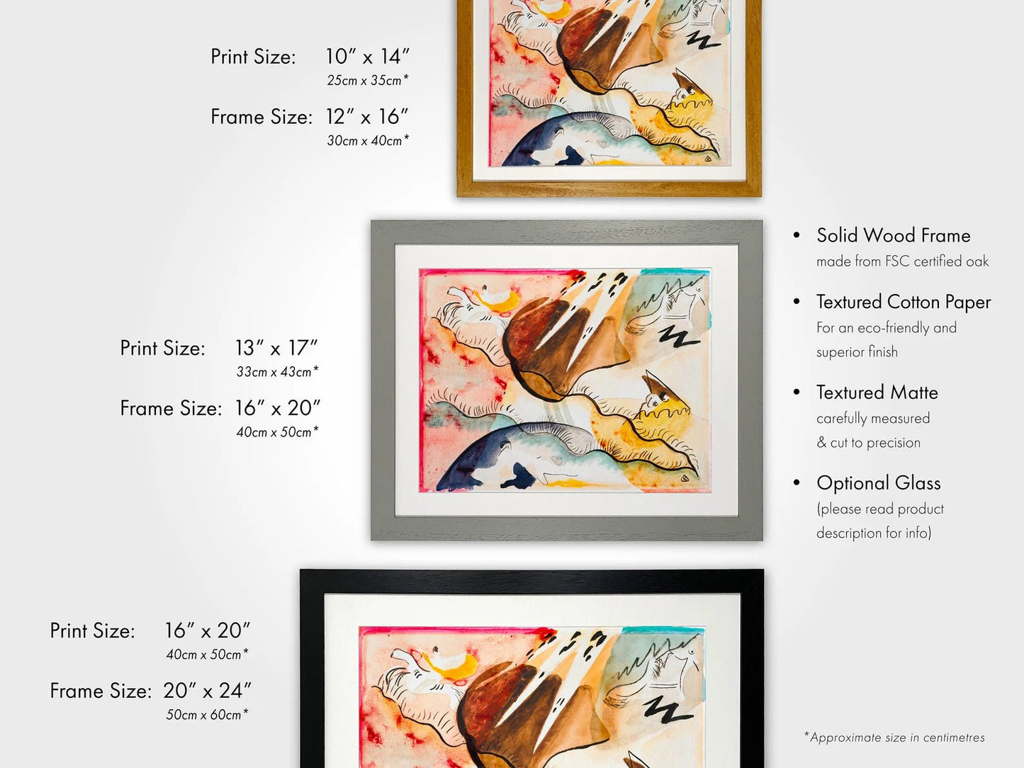 Tous nos produits encadrés incluent notre papier d'art en coton texturé en raison de ses propriétés d'archivage et de sa résistance aux éraflures et aux empreintes digitales. Cela signifie que l'œuvre peut être présentée "exposée" et sans glaçure pour un aspect optimal.