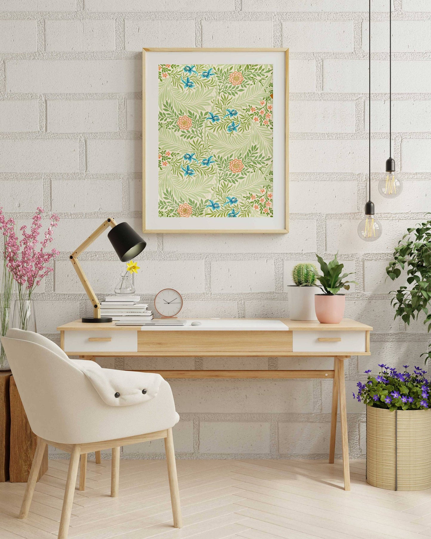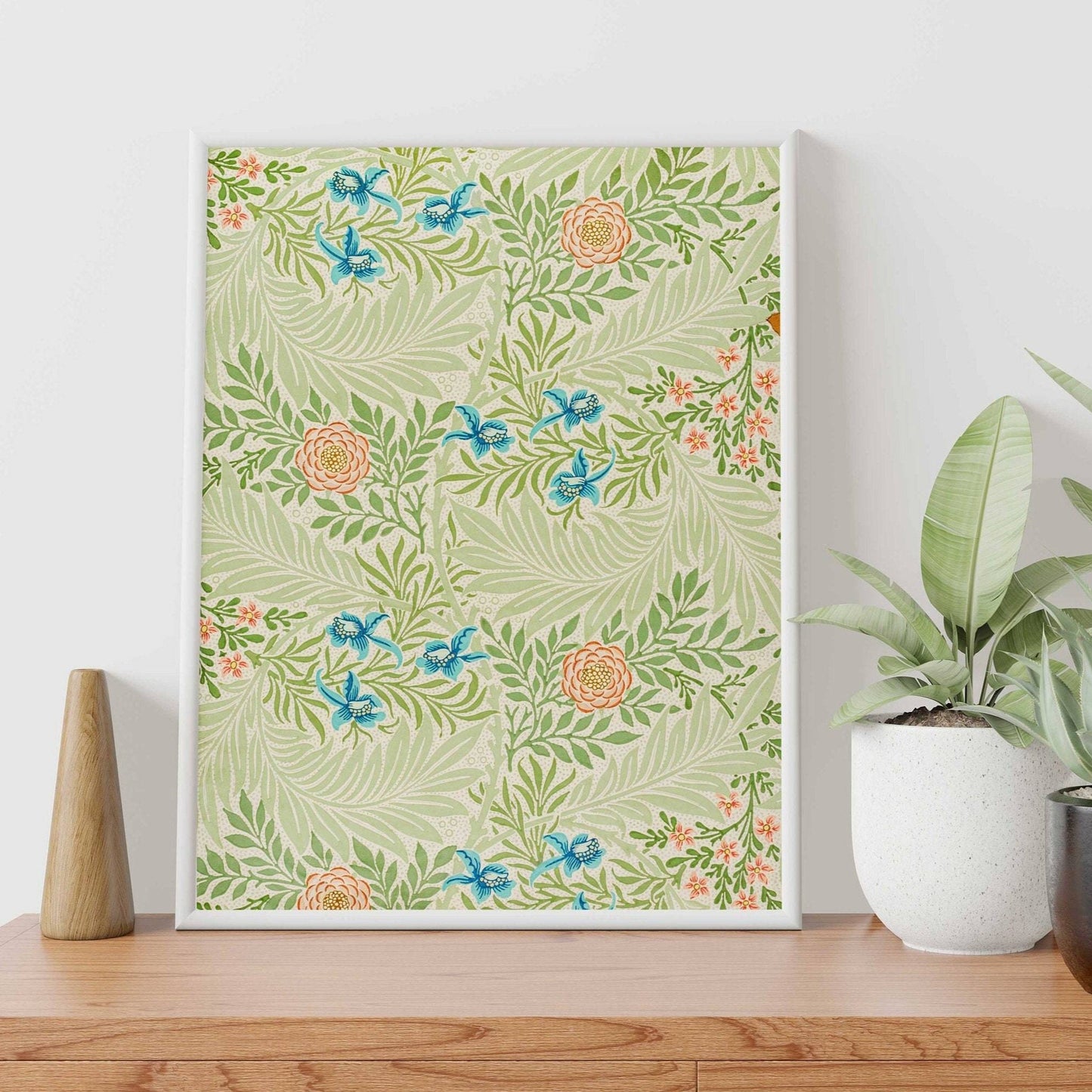 Un motif de tissu intitulé « Larkspur » par le célèbre designer textile britannique William Morris, disponible sur commande en tant qu'impression d'art giclée haut de gamme avec une large gamme d'options de cadrage.