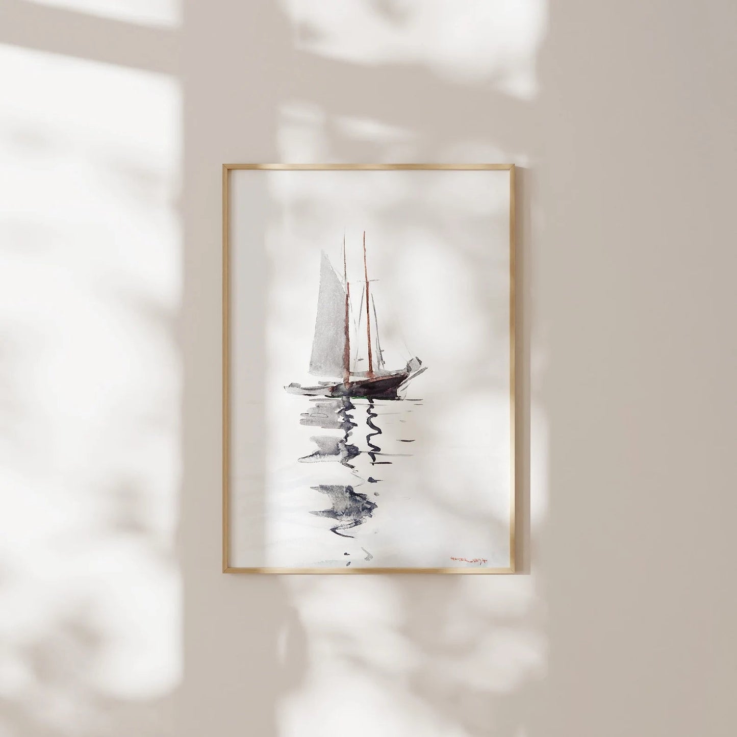 La peinture à l'huile sur toile classique de Winslow Homer " Goélette à deux mâts avec Dory " est disponible en impression giclée haute résolution dans une variété de tailles sur mesure.