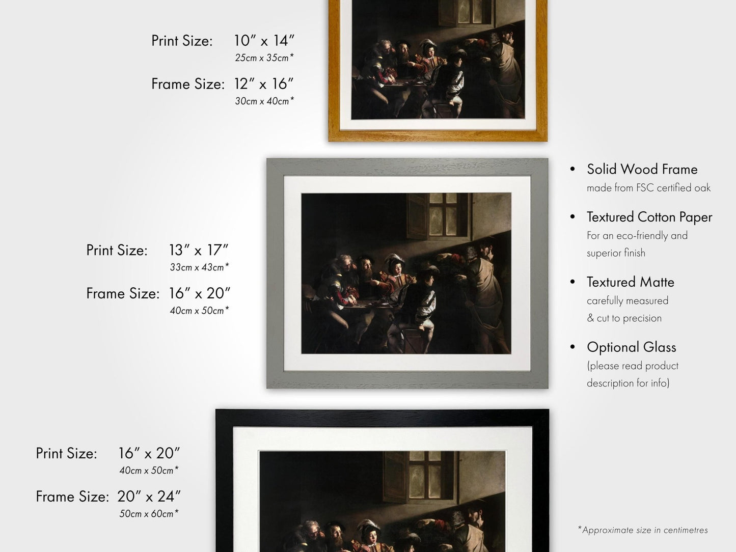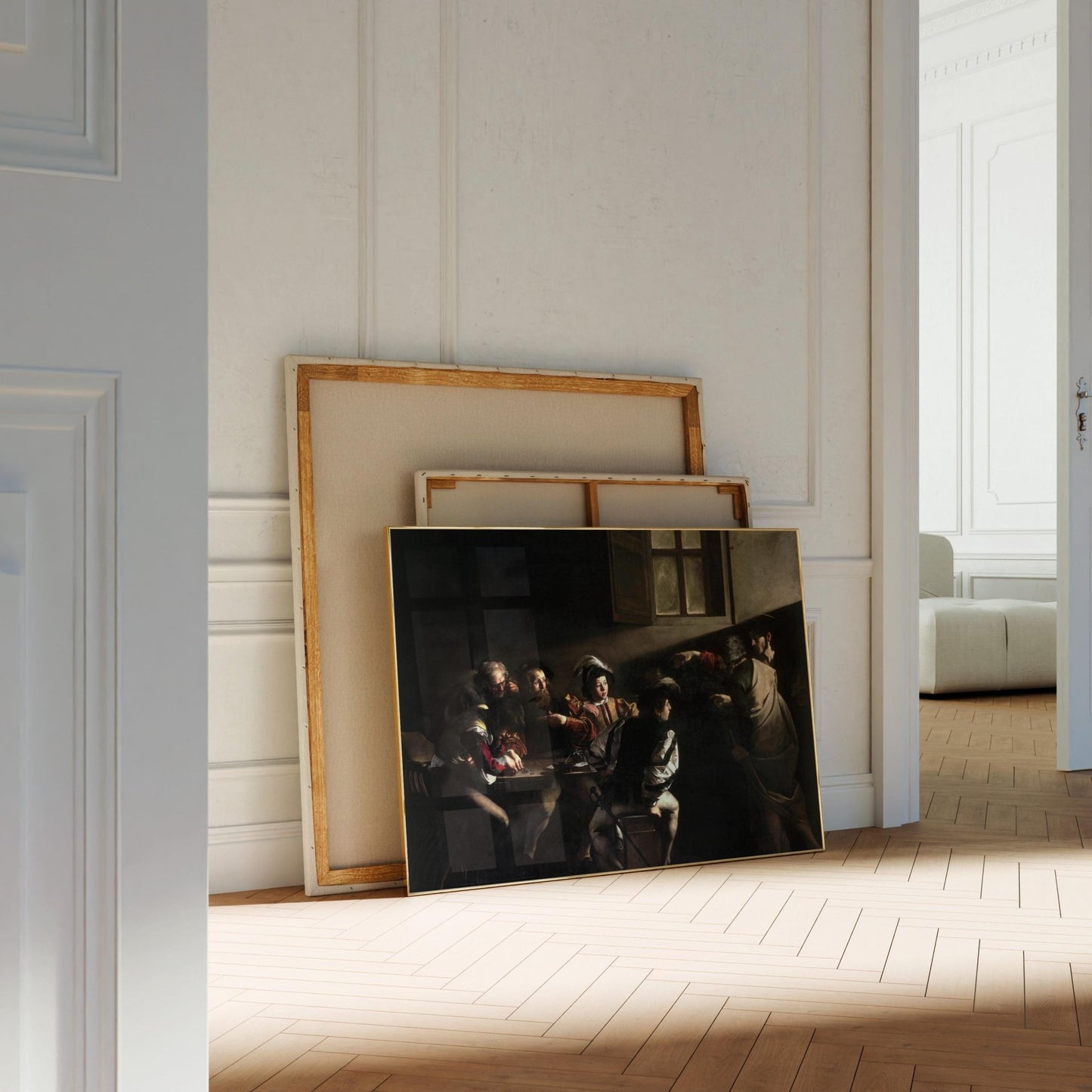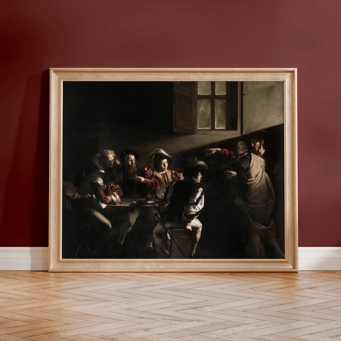 Caravaggio's classic painting titled 'The Calling Of Saint Matthew', available as a giclée print and with a selection of framing options.