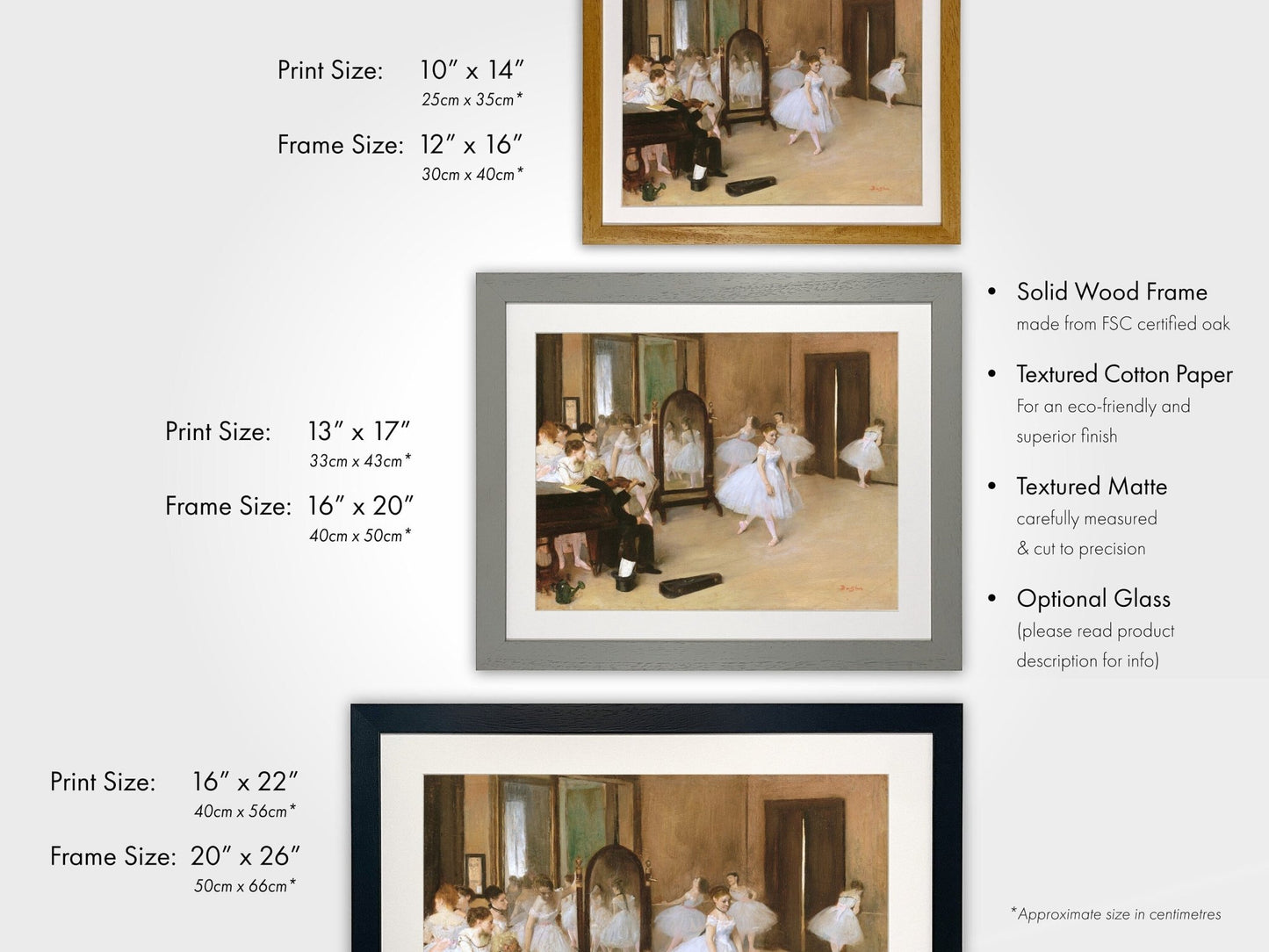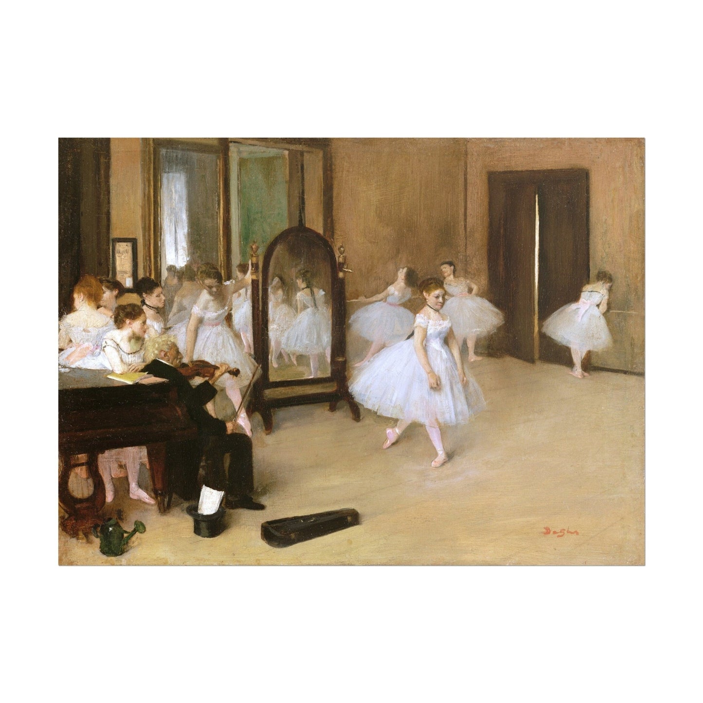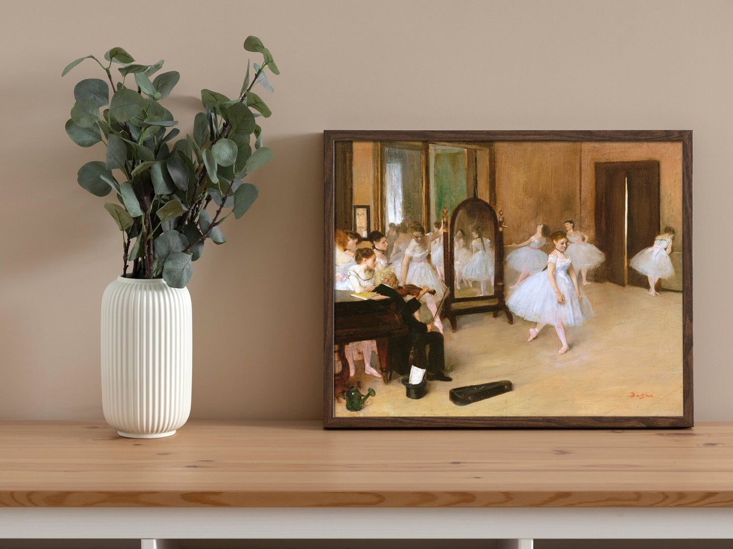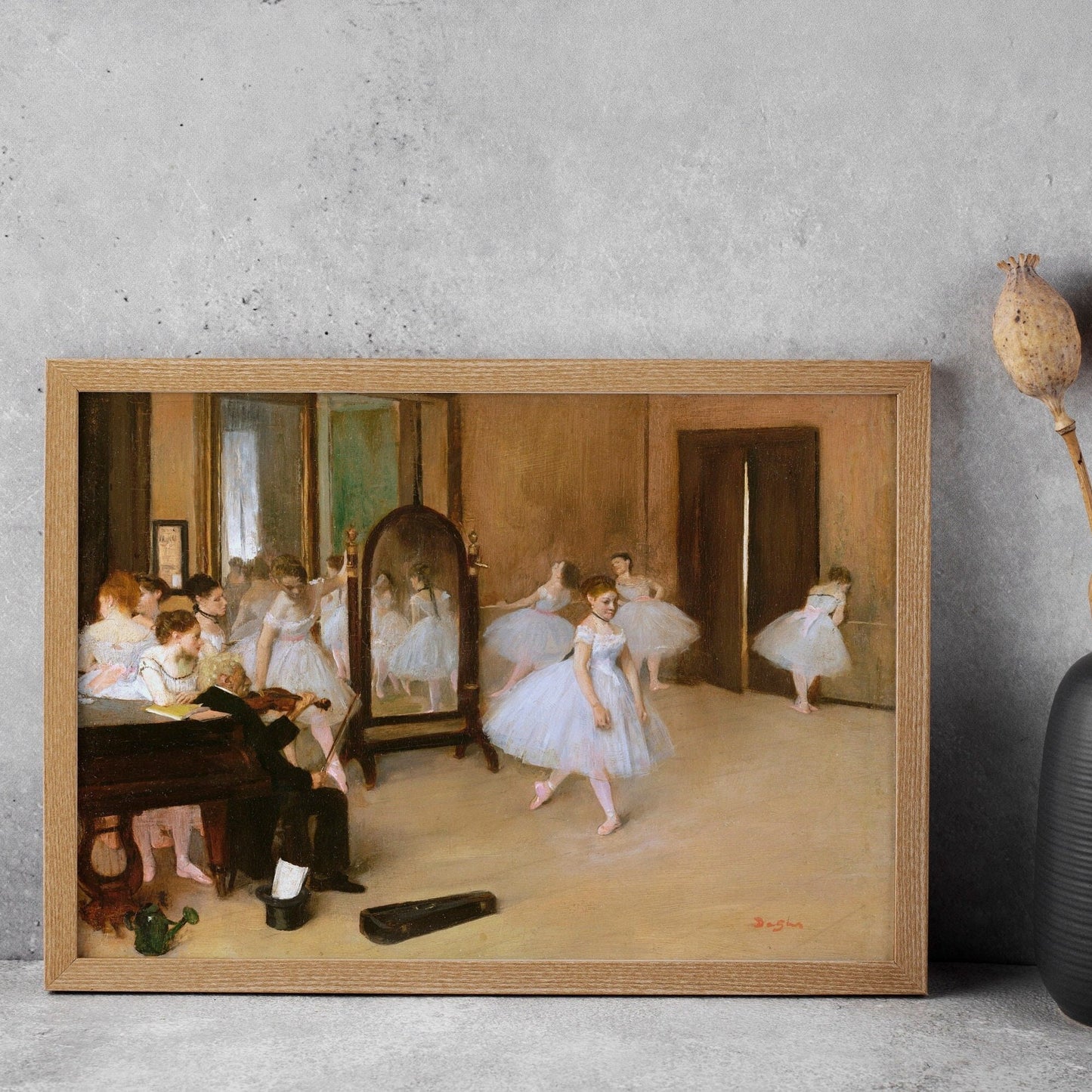 Edgar Degas' classic oil-on-canvas painting titled 'The Dancing Class', available as a giclée print with a variety of framing options.