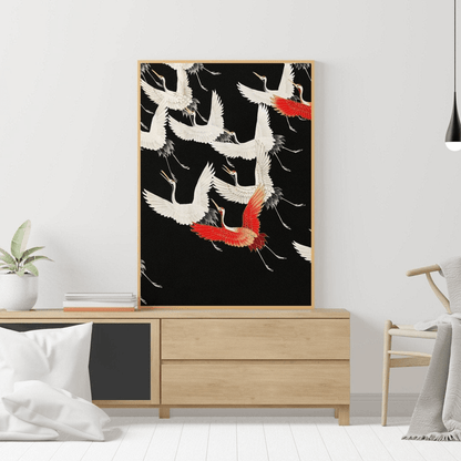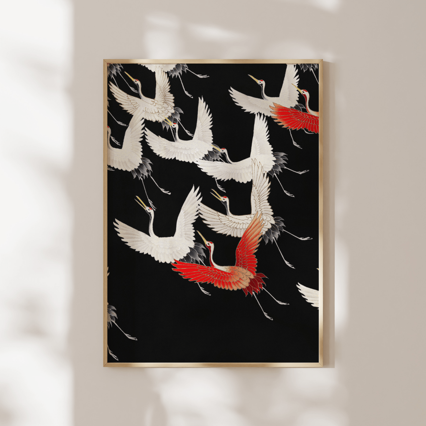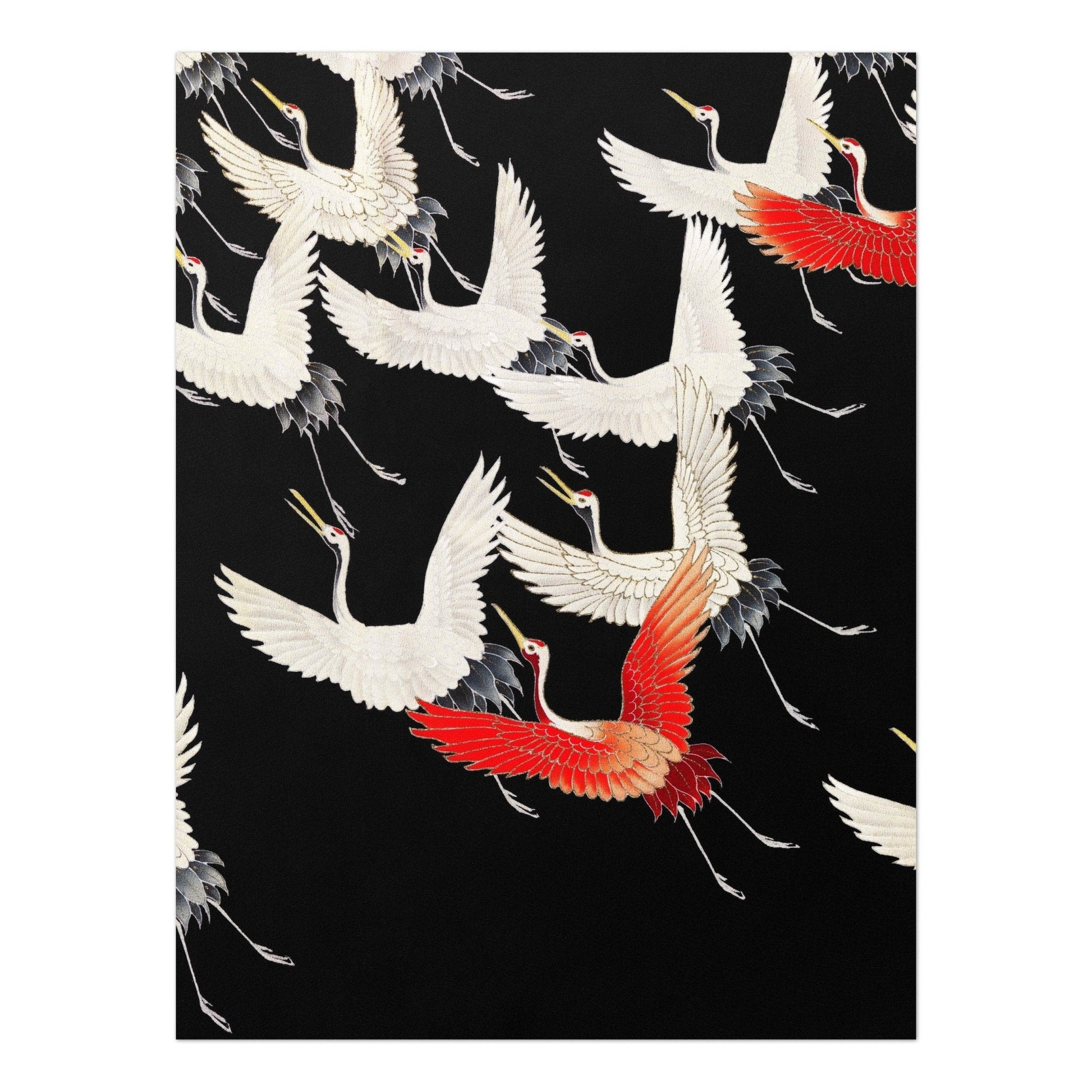 A traditional piece of Japanese silk art titled 'Furisode with a Myriad of Flying Cranes', available to order as a premium giclée art print with a wide range of framing options.