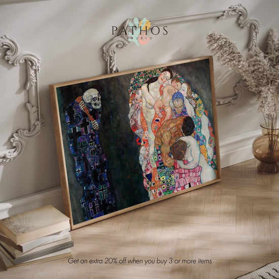 Painted in 1910 and revised in 1915, this striking allegorical work is celebrated for its vivid colours, intricate patterns, and powerful symbolism, juxtaposing a skeletal figure of Death with a cluster of embracing human forms that embody vitality, love, and renewal in Klimt’s distinctive style.