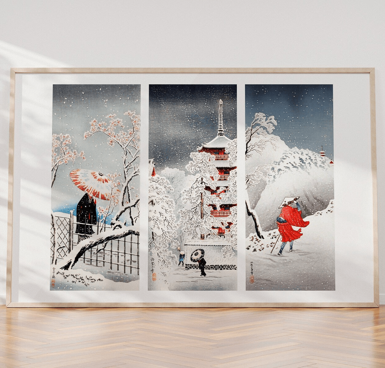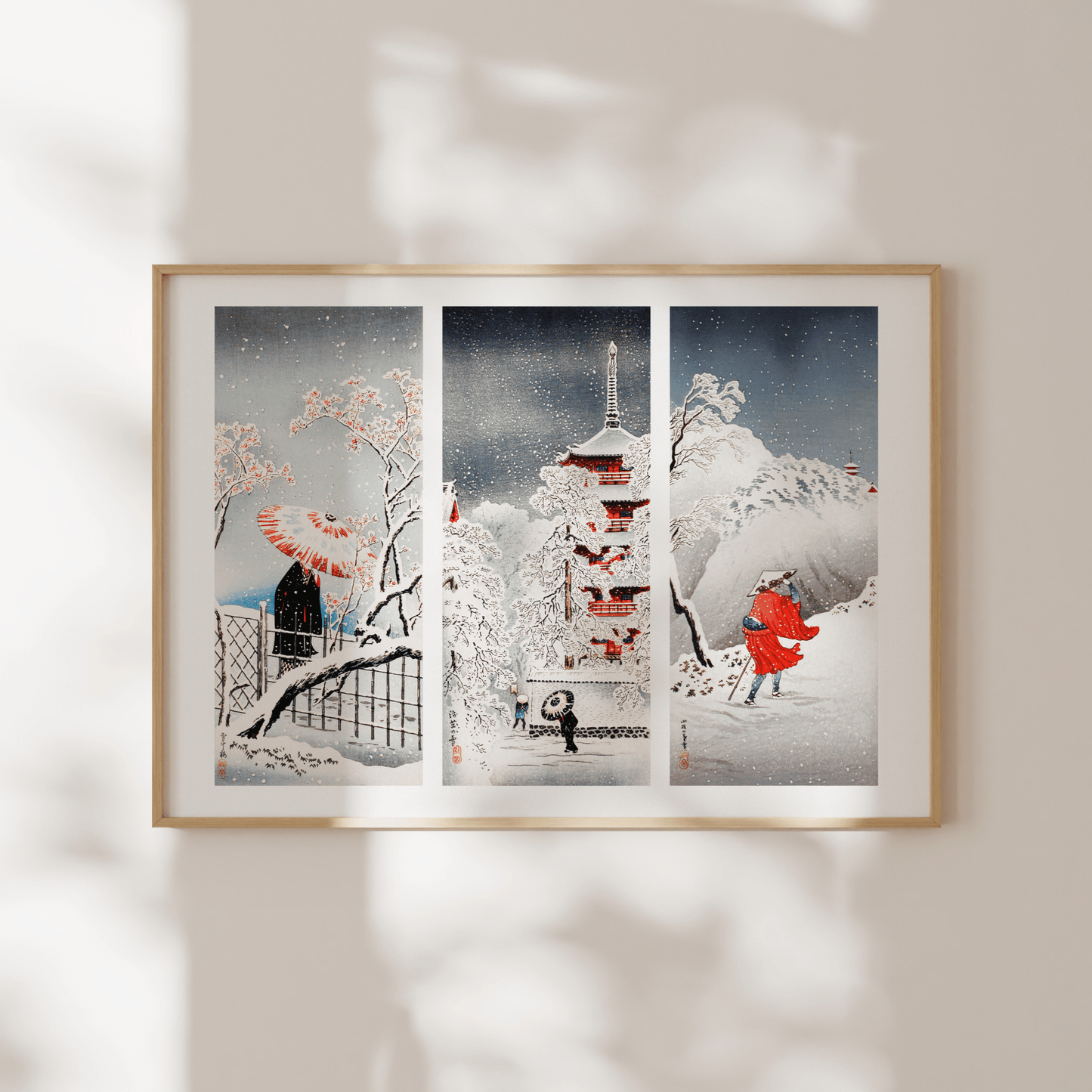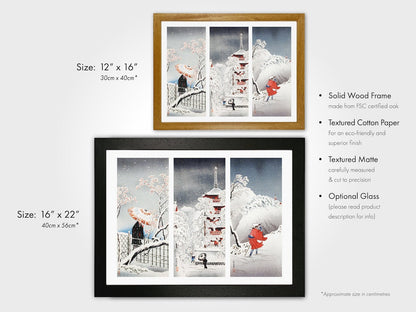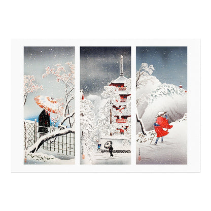 Hiroaki Takahashi's woodblock painting 'Plum Tree in Snow / Snow at Asakusa / Snowy Evening', available to order as a premium giclée art print with a wide range of framing options.