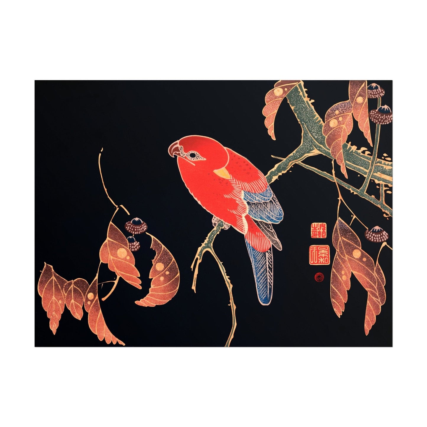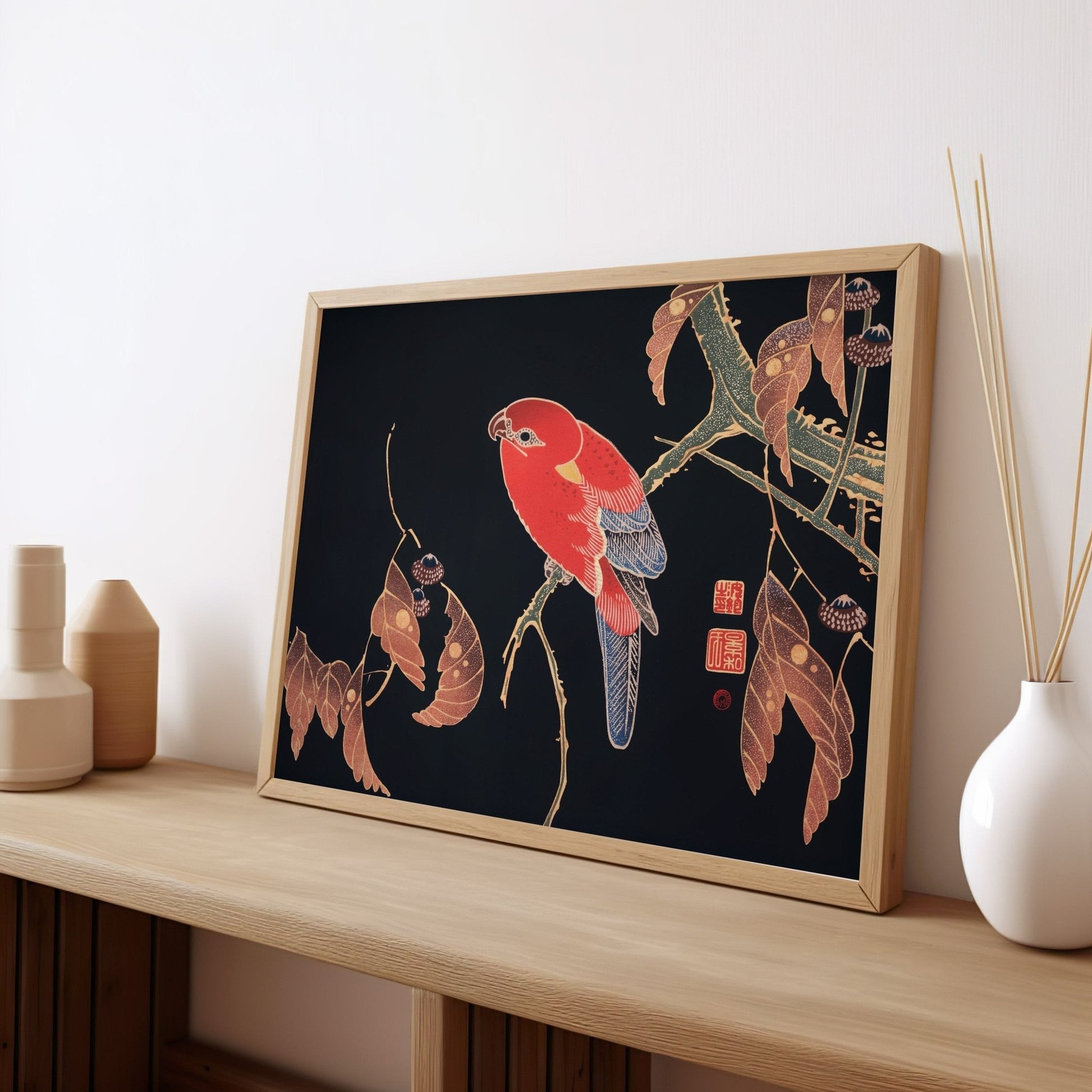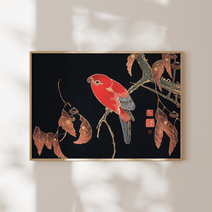 Ito Jakuchu's classic 20th Century woodblock illustration 'Red Parrot on the Branch of a Tree', available to order as a premium giclée art print with a wide range of framing options.