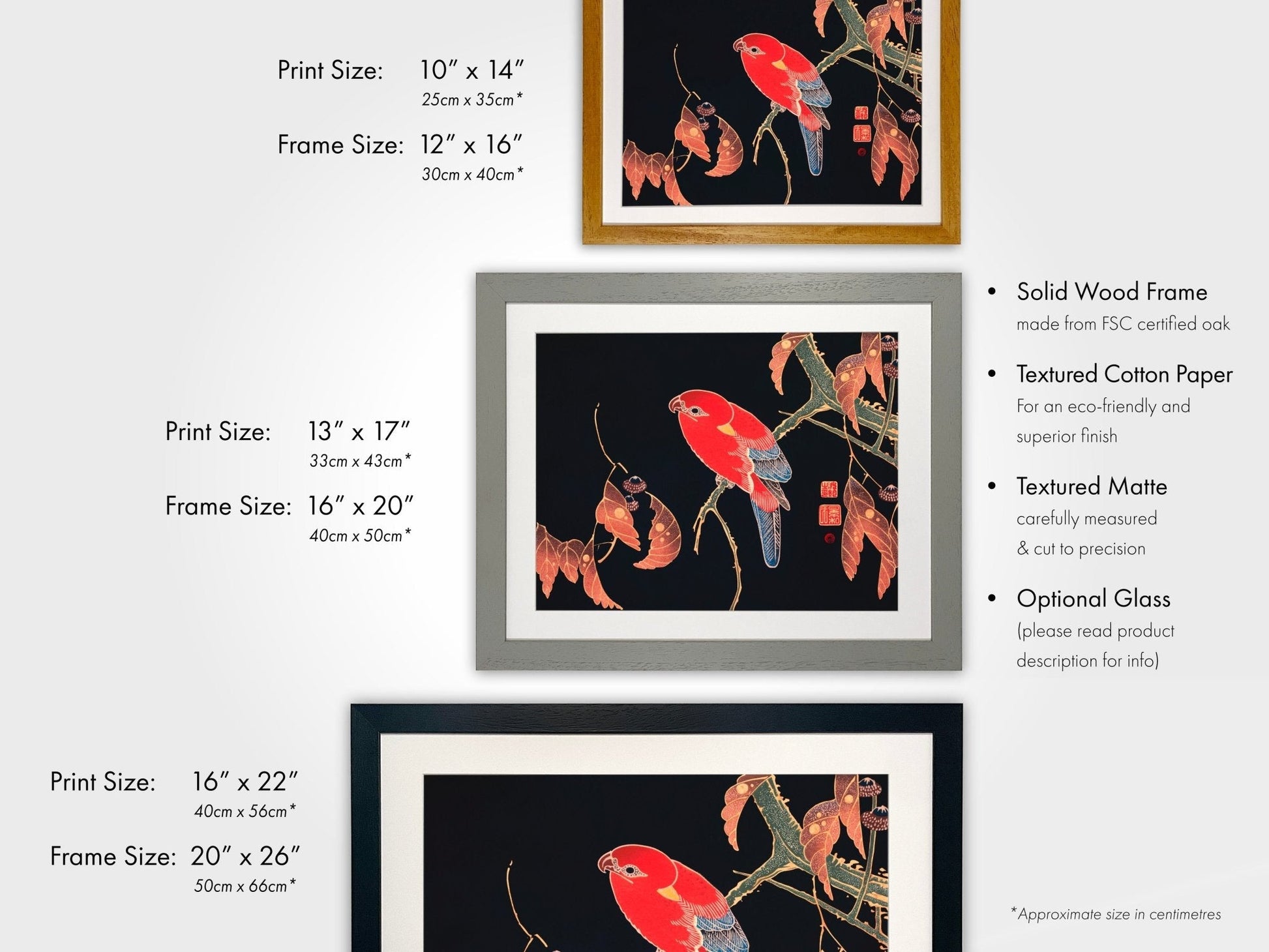 Please see related images for our range of frame options and detailed sizing information.