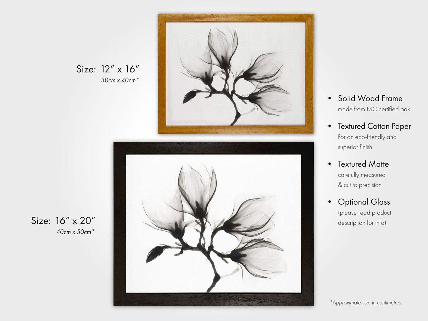 A photograph titled 'Magnolia Branch with Four Flowers', available as a giclée print with a variety of framing options.