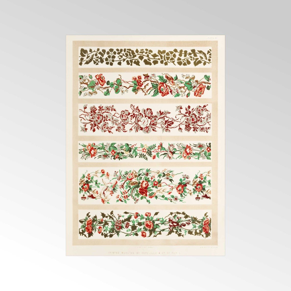A lithograph of Printed muslins, featured in 'The Industrial Arts of the 19th Century' by renowned British architect and art historian Sir Matthew Digby Wyatt. Available to order as a premium giclée art print with a wide range of framing options.