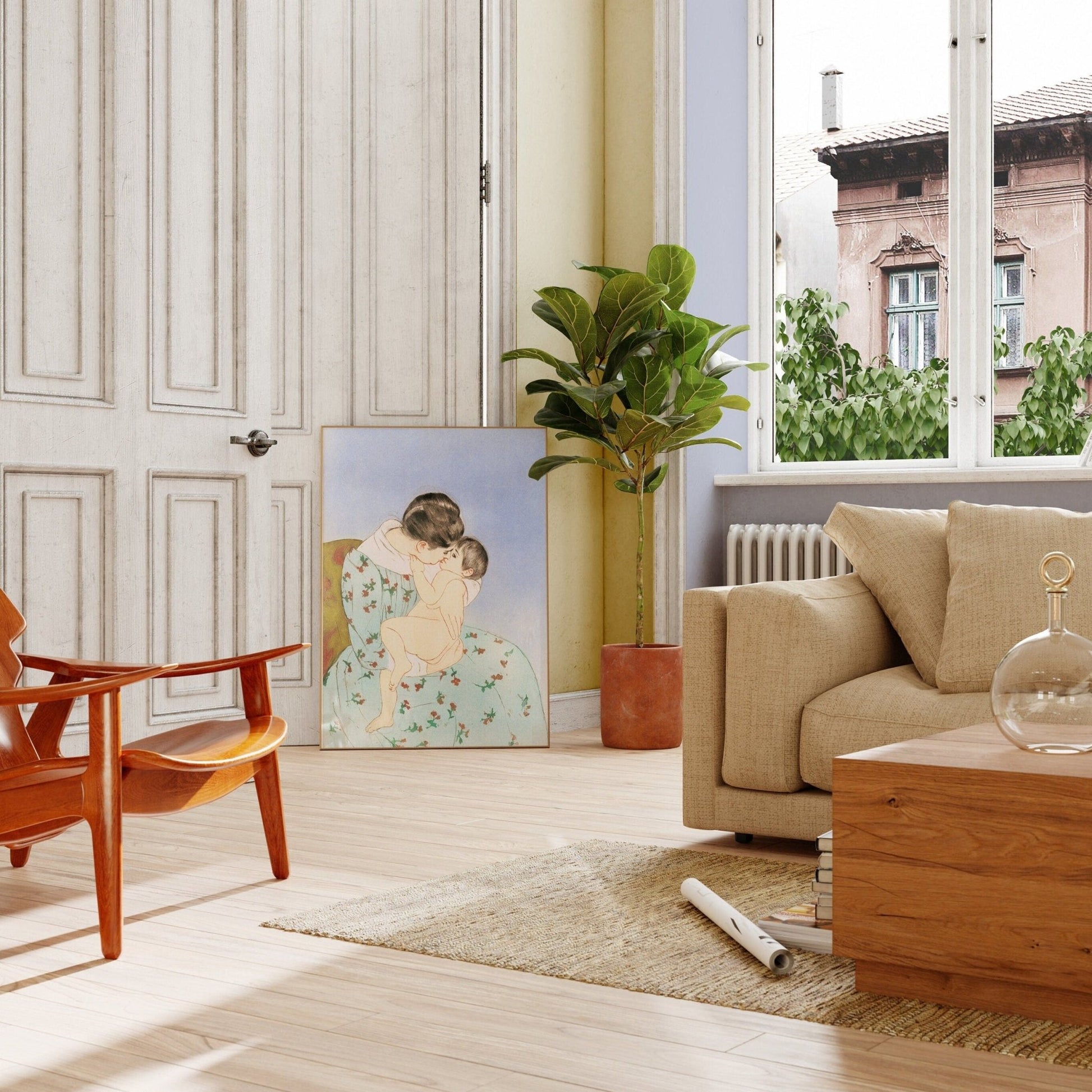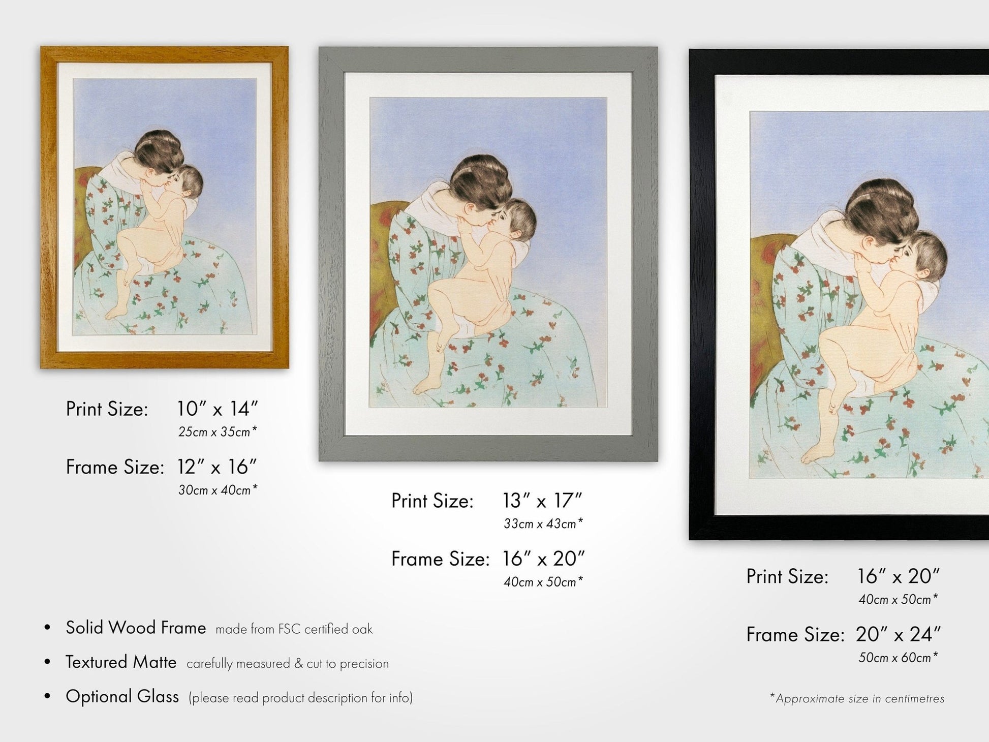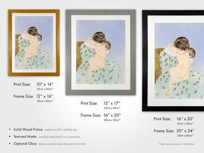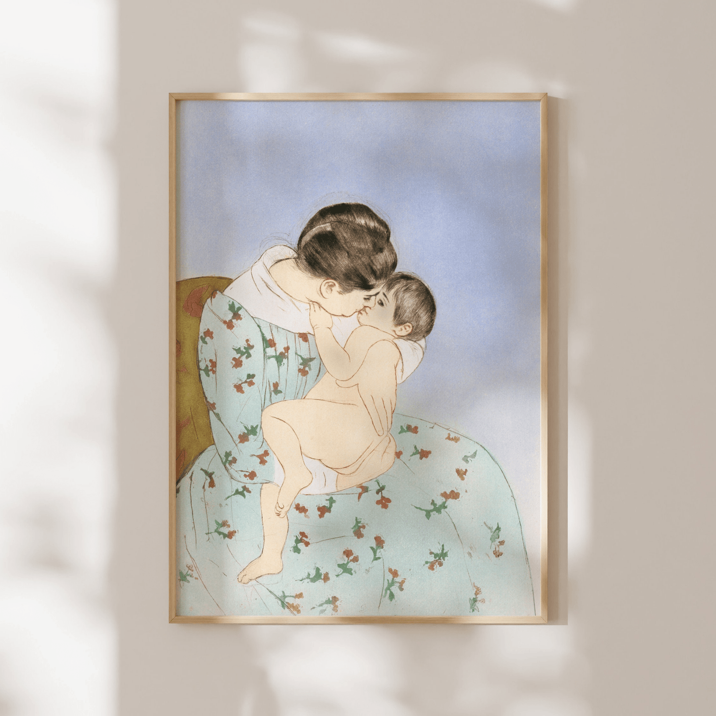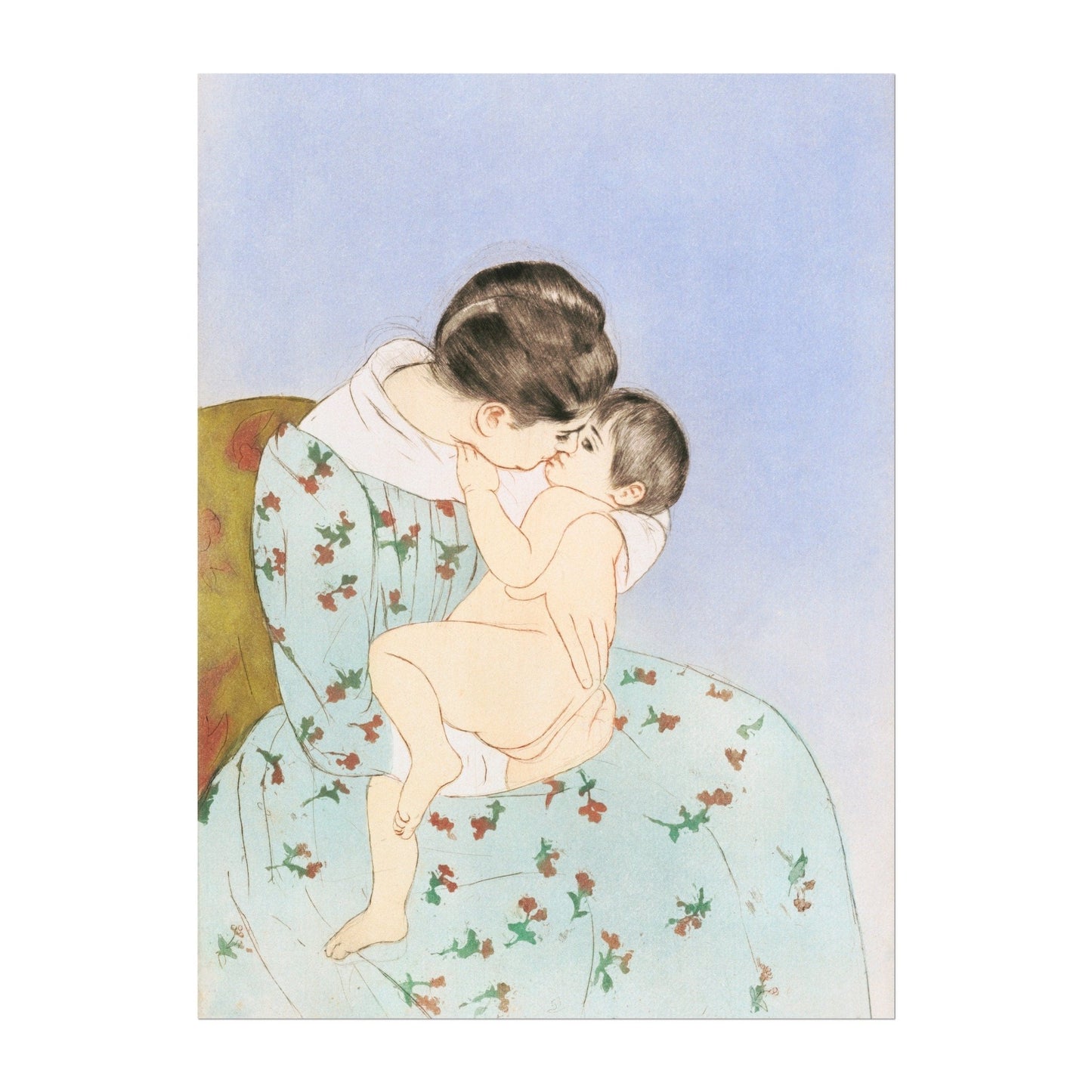 Mary Cassatt's classic artwork titled 'Mother's Kiss', available as a giclée print and with a selection of framing options.