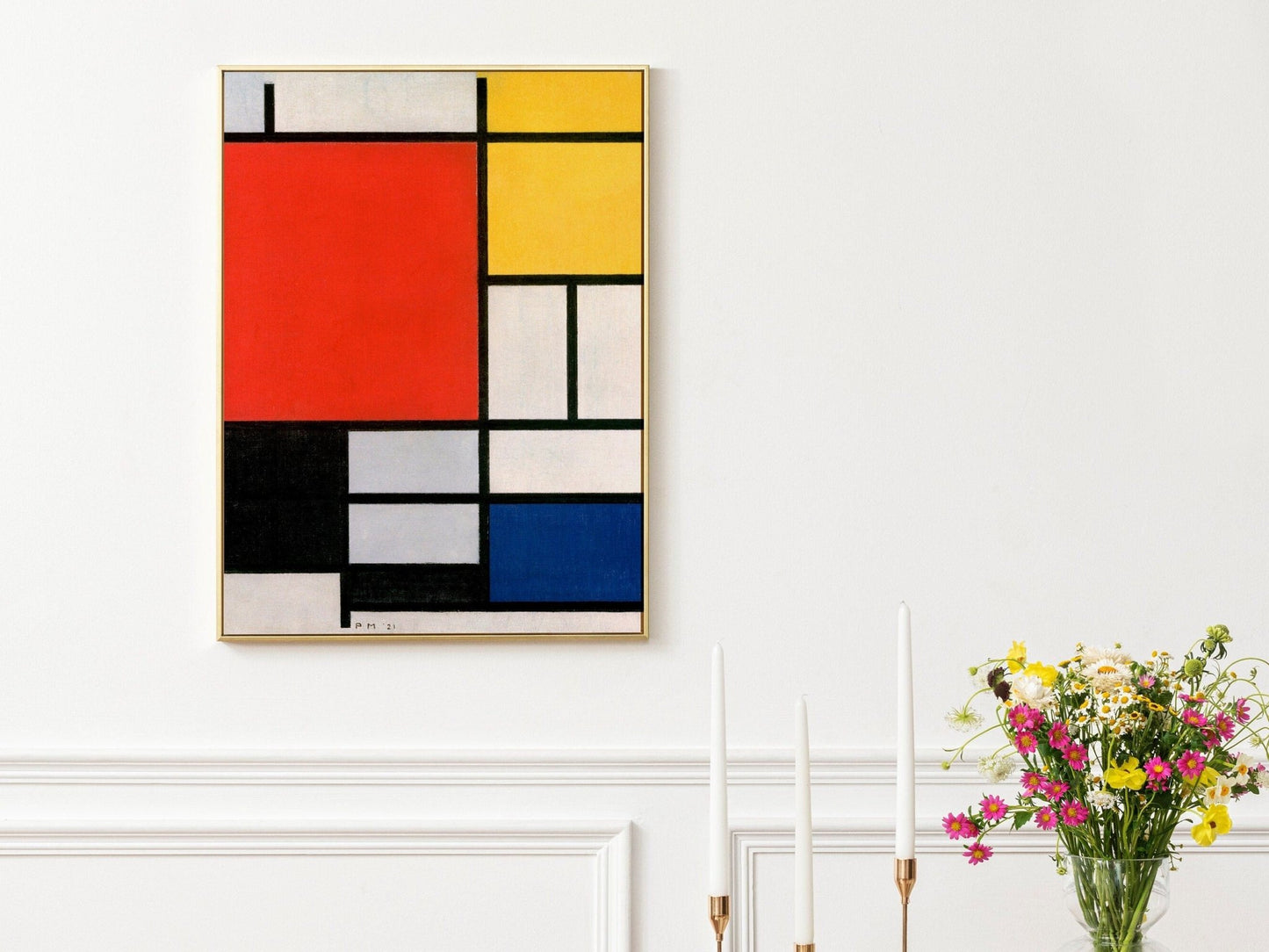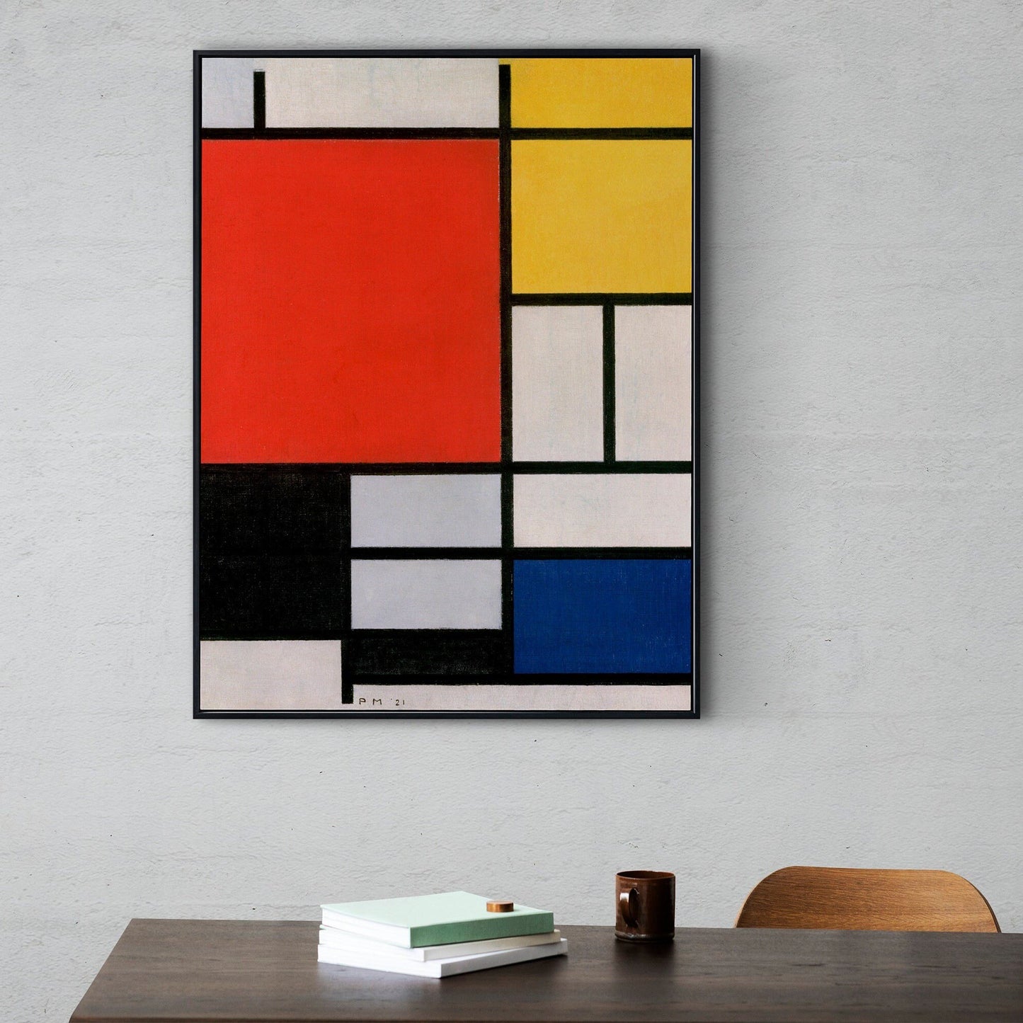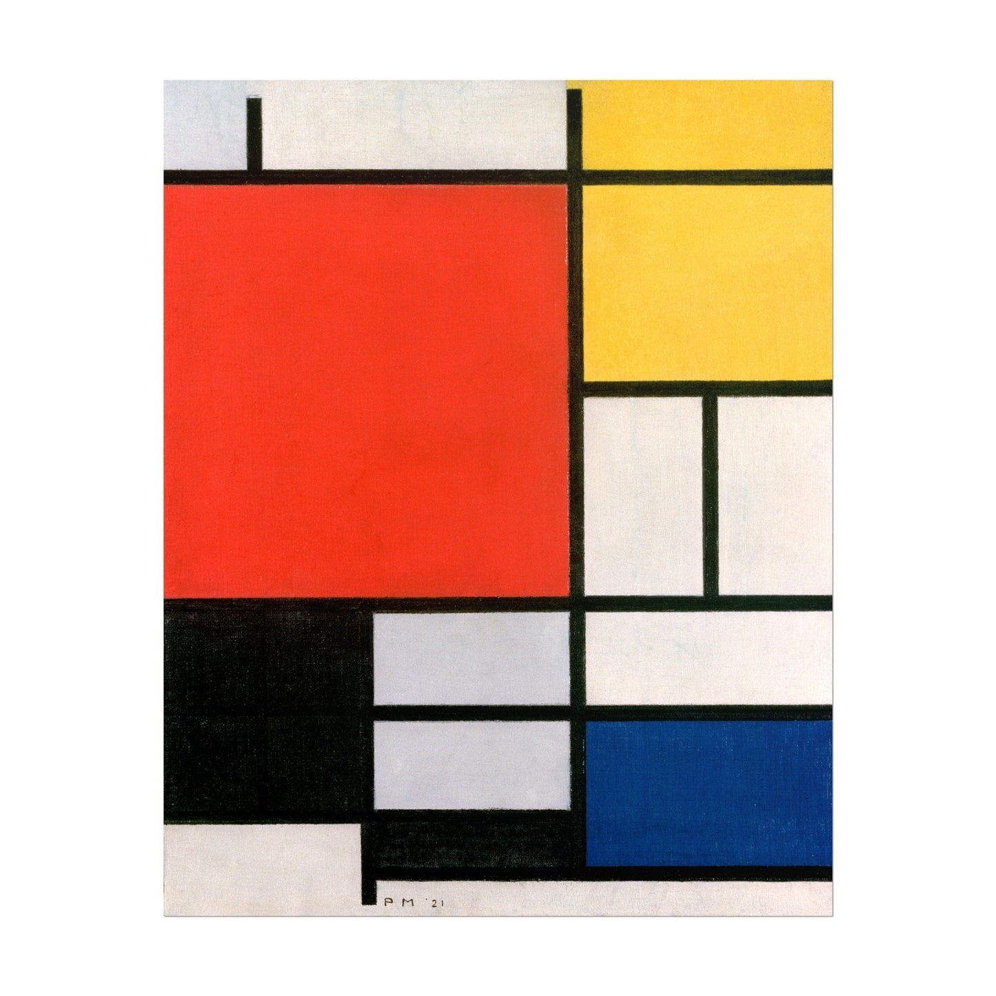 A classic abstract work titled 'Composition with Red, Yellow, Blue, and Black' by Piet Mondrian.