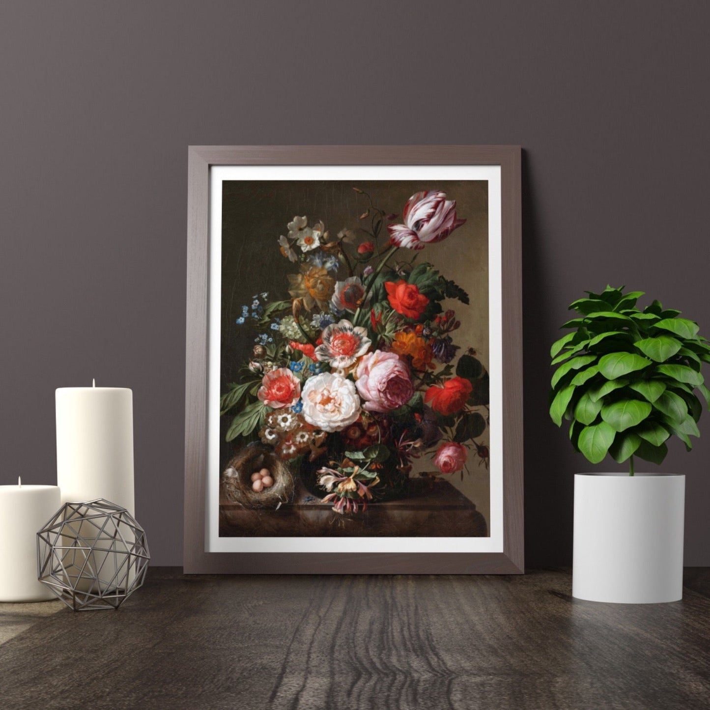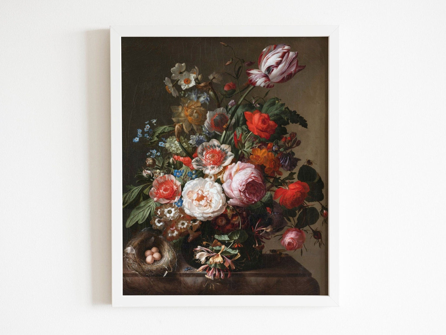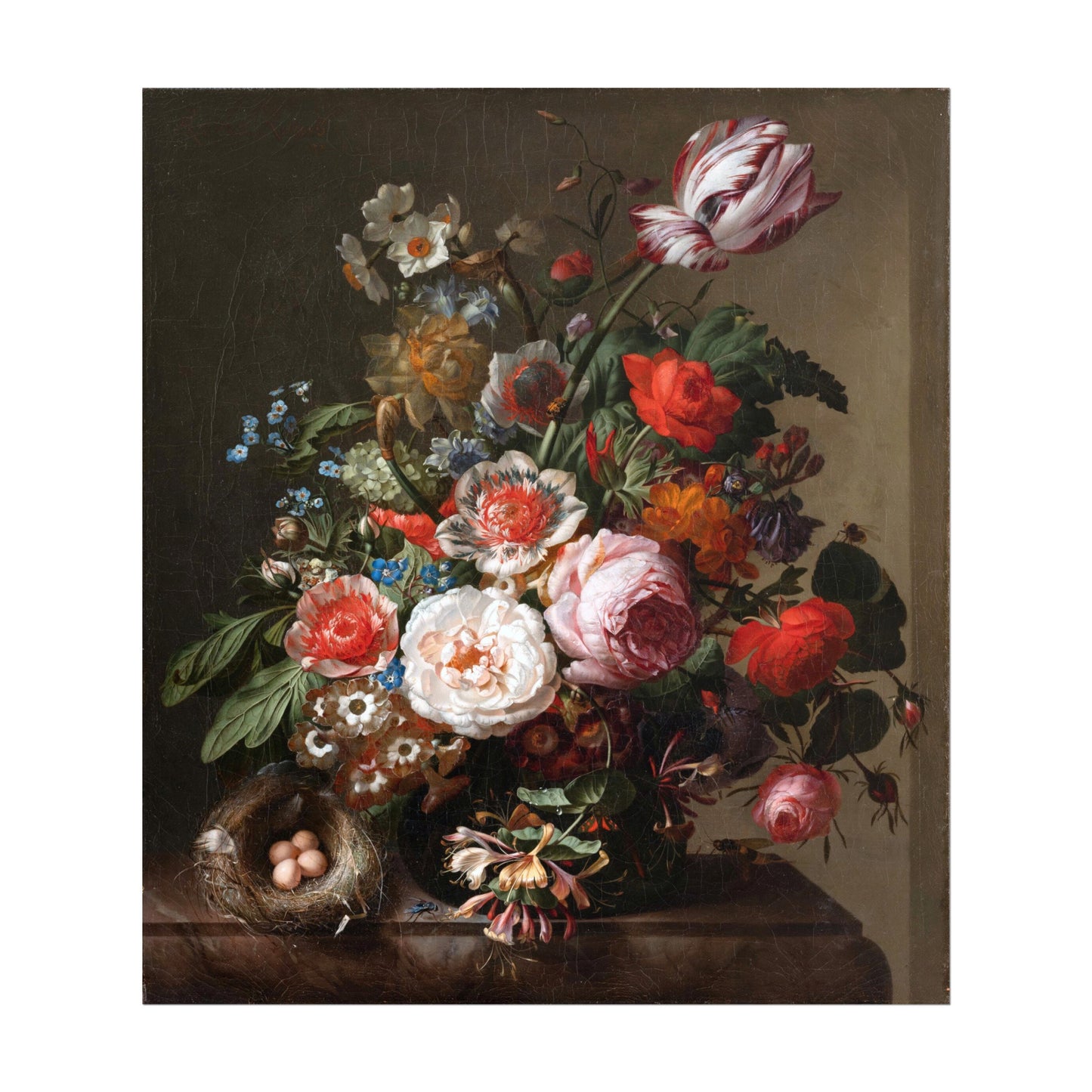 A botanical illustration by Rachel Ruysch titled 'Flowers In A Vase With A Bird's Nest ', available to order as a premium giclée art print with a wide range of framing options.