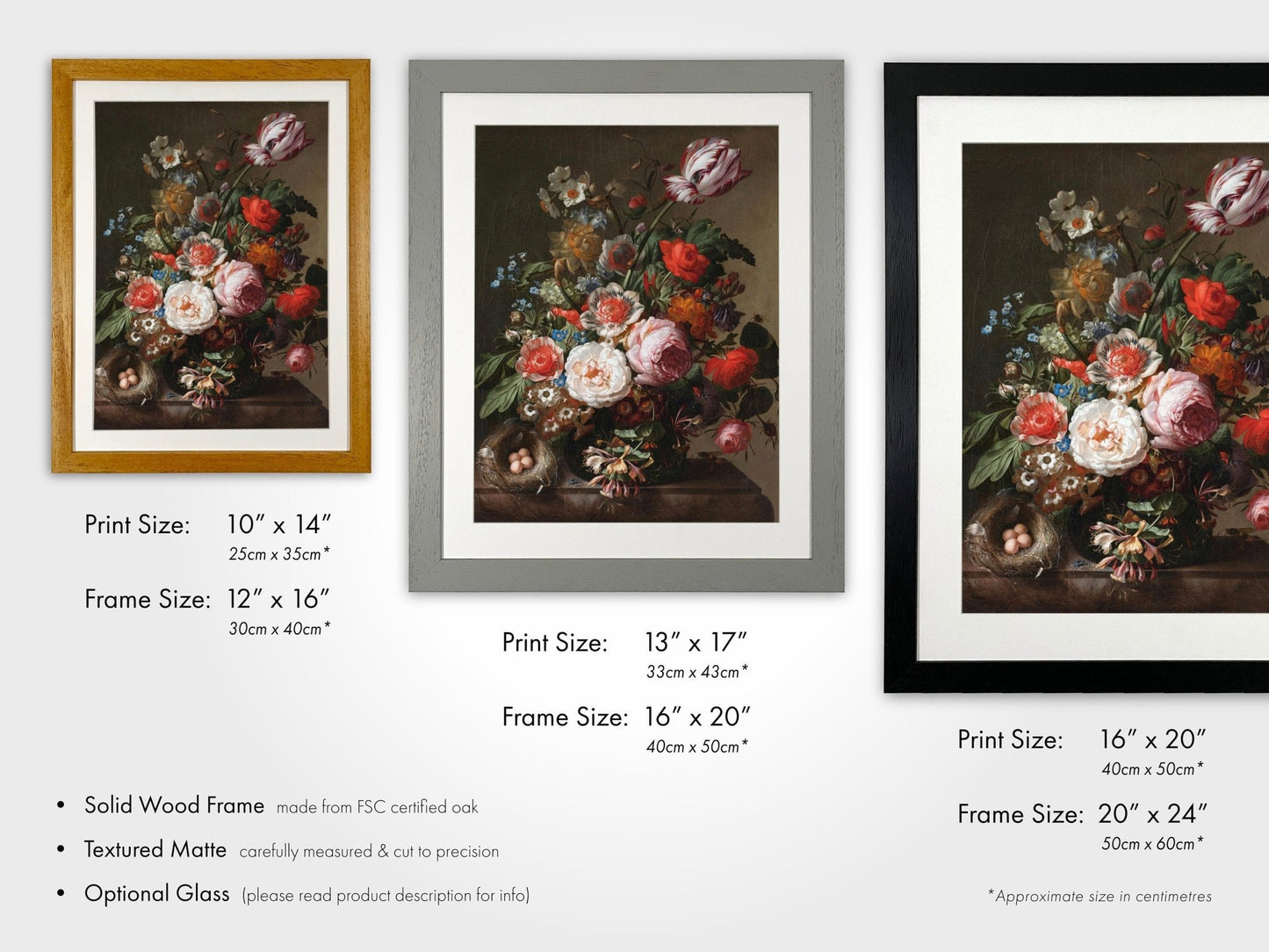 If you would like your frame to include glass glazing, then please get in touch for a custom quote. We recommend purchasing glass if you plan to hang your framed print in an area susceptible to moisture, such as in the bathroom.