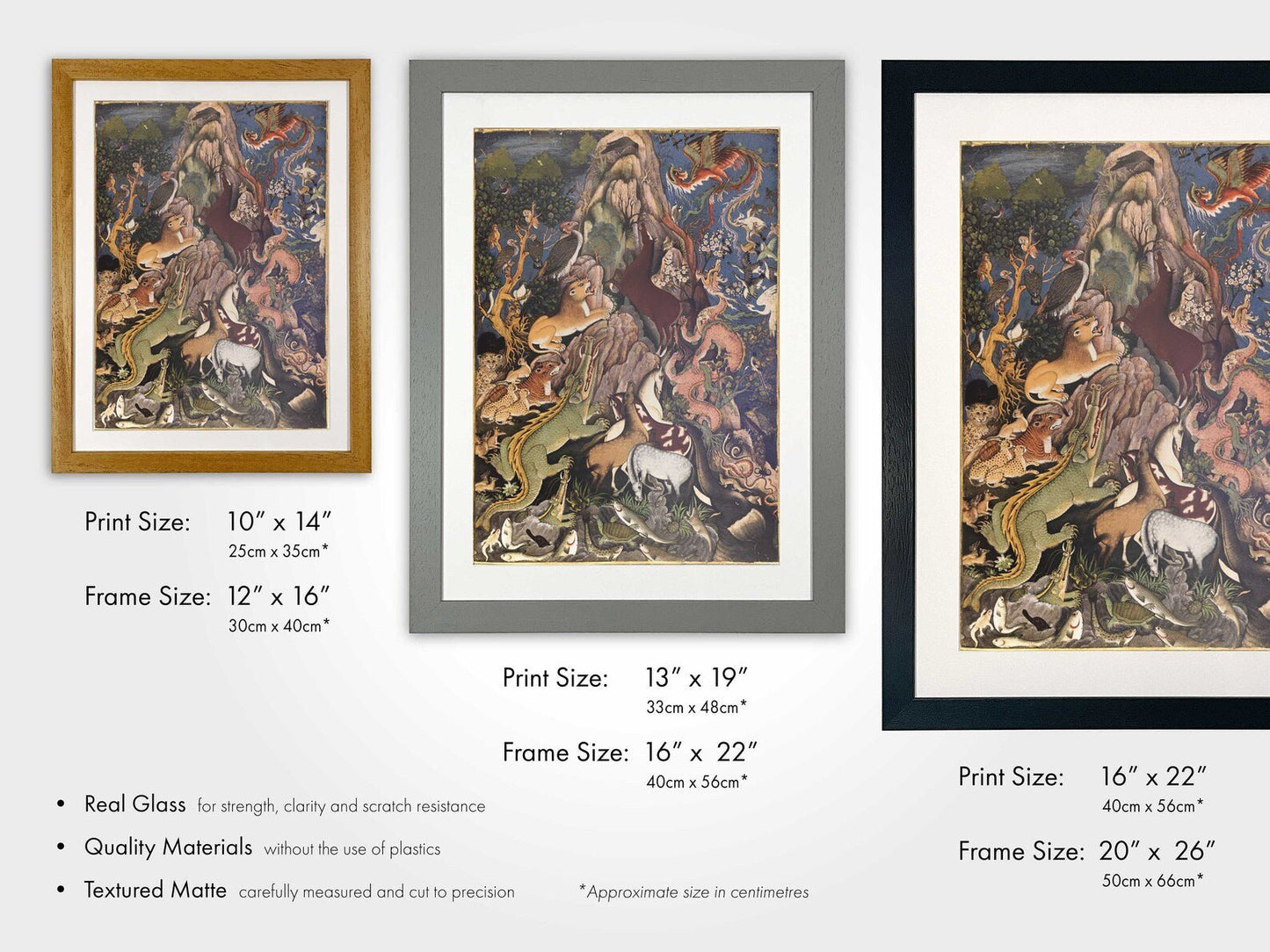 If you would like your frame to include glass glazing, then please get in touch for a custom quote. We recommend purchasing glass if you plan to hang your framed print in an area susceptible to moisture, such as in the bathroom.