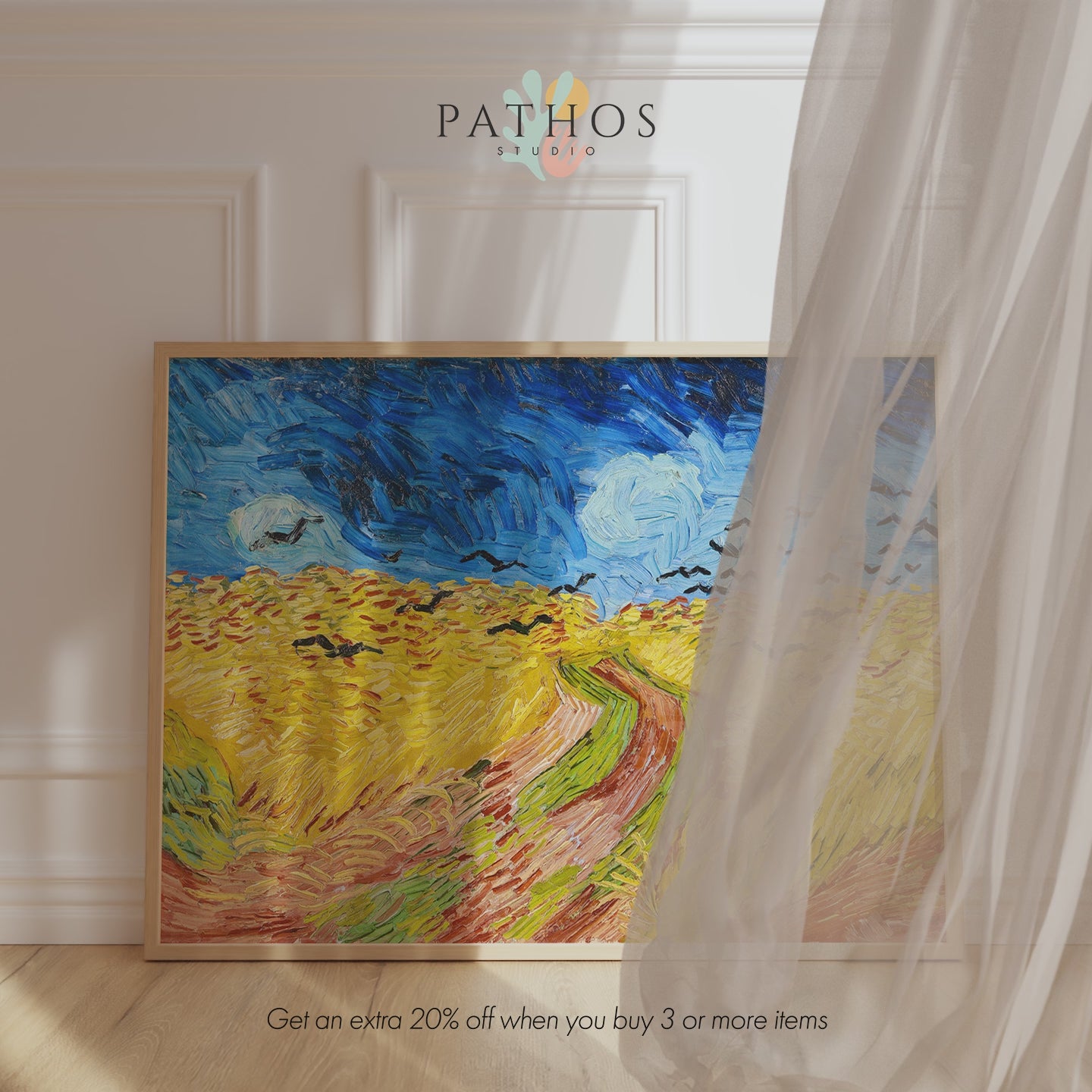Wheatfield with Crows is an oil-on-canvas painting by Dutch artist Vincent van Gogh, available here as a premium giclée print with a selection of framing options.Painted in 1890 in Auvers-sur-Oise during the final weeks of his life, this dramatic landscape shows a turbulent sky over a windswept wheatfield, cut by a wandering path and stirred by a flock of dark crows. Van Gogh’s urgent brushwork, bold colour contrasts, and expressive texture create a scene that feels both intense and atmospheric.