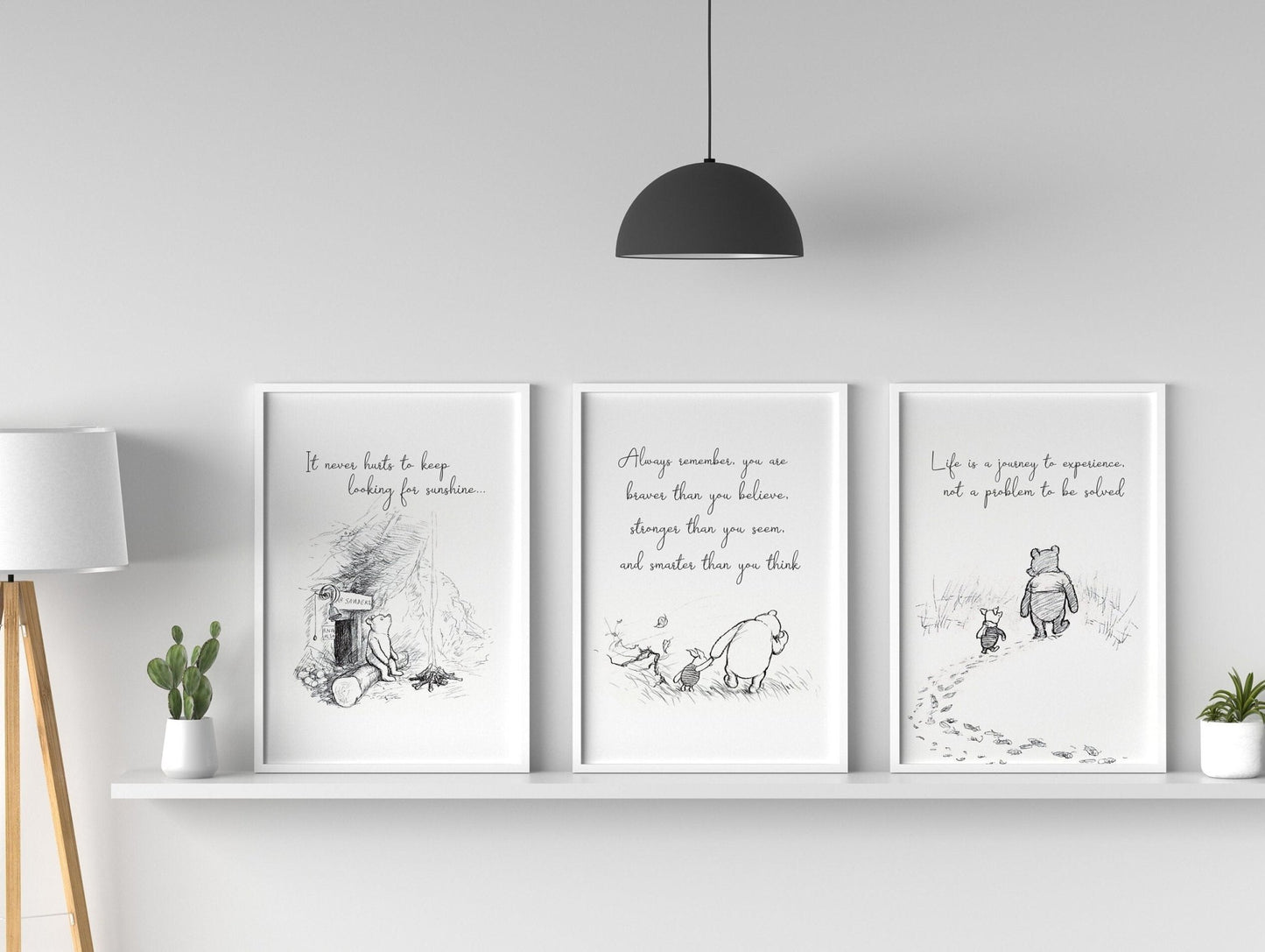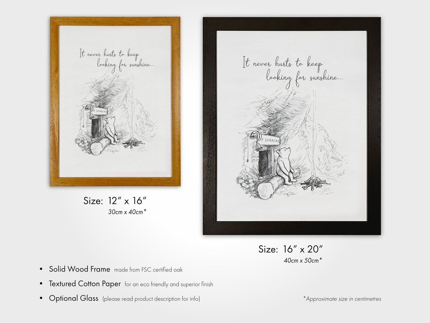 A Winnie The Pooh print featuring an inspirational quote, and a classic illustration by E. H. Shephard.