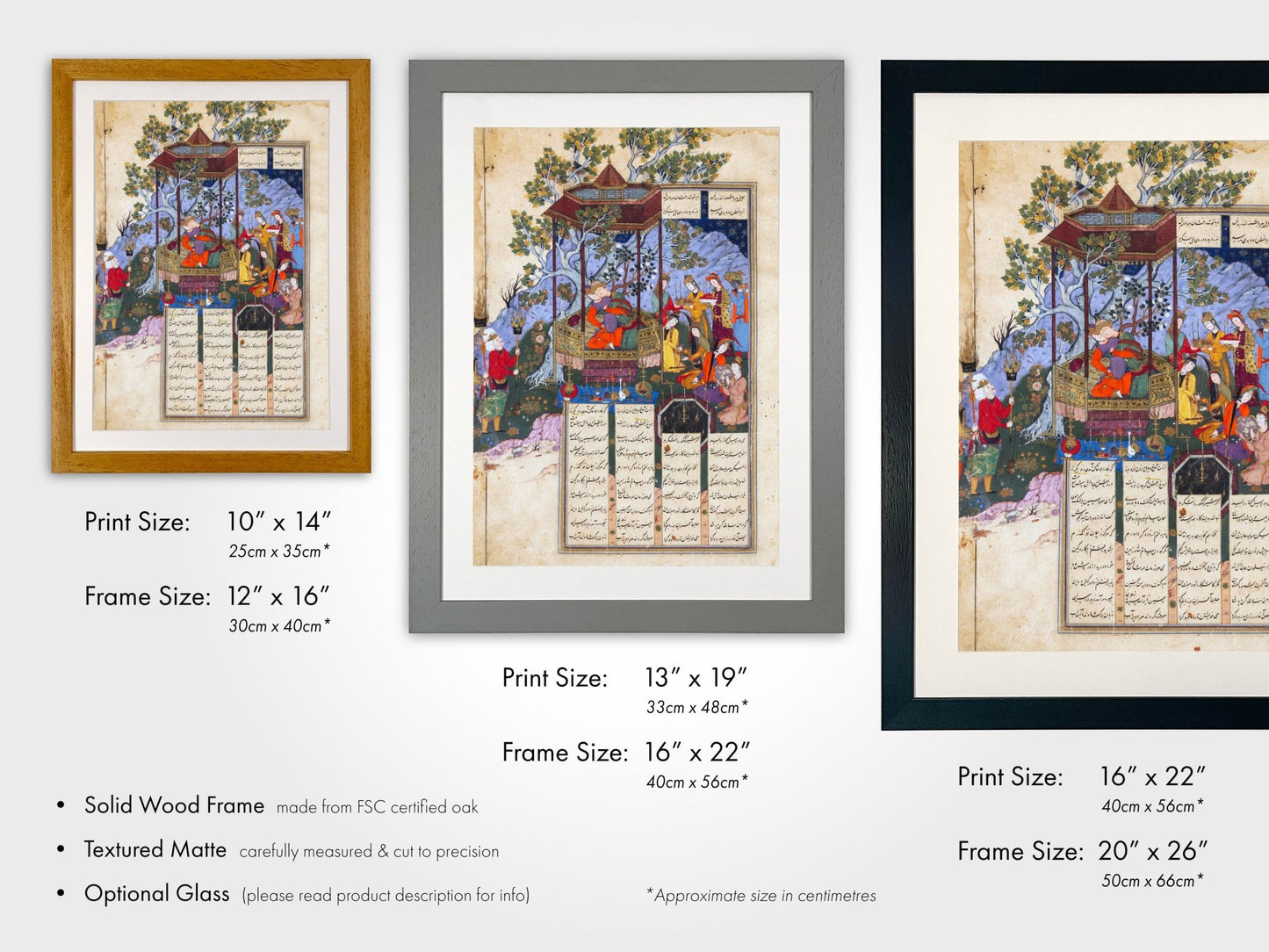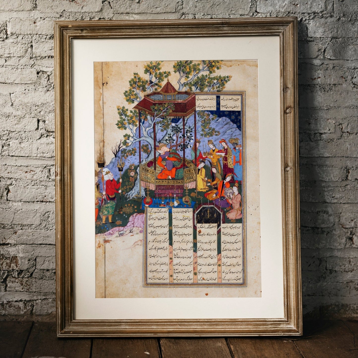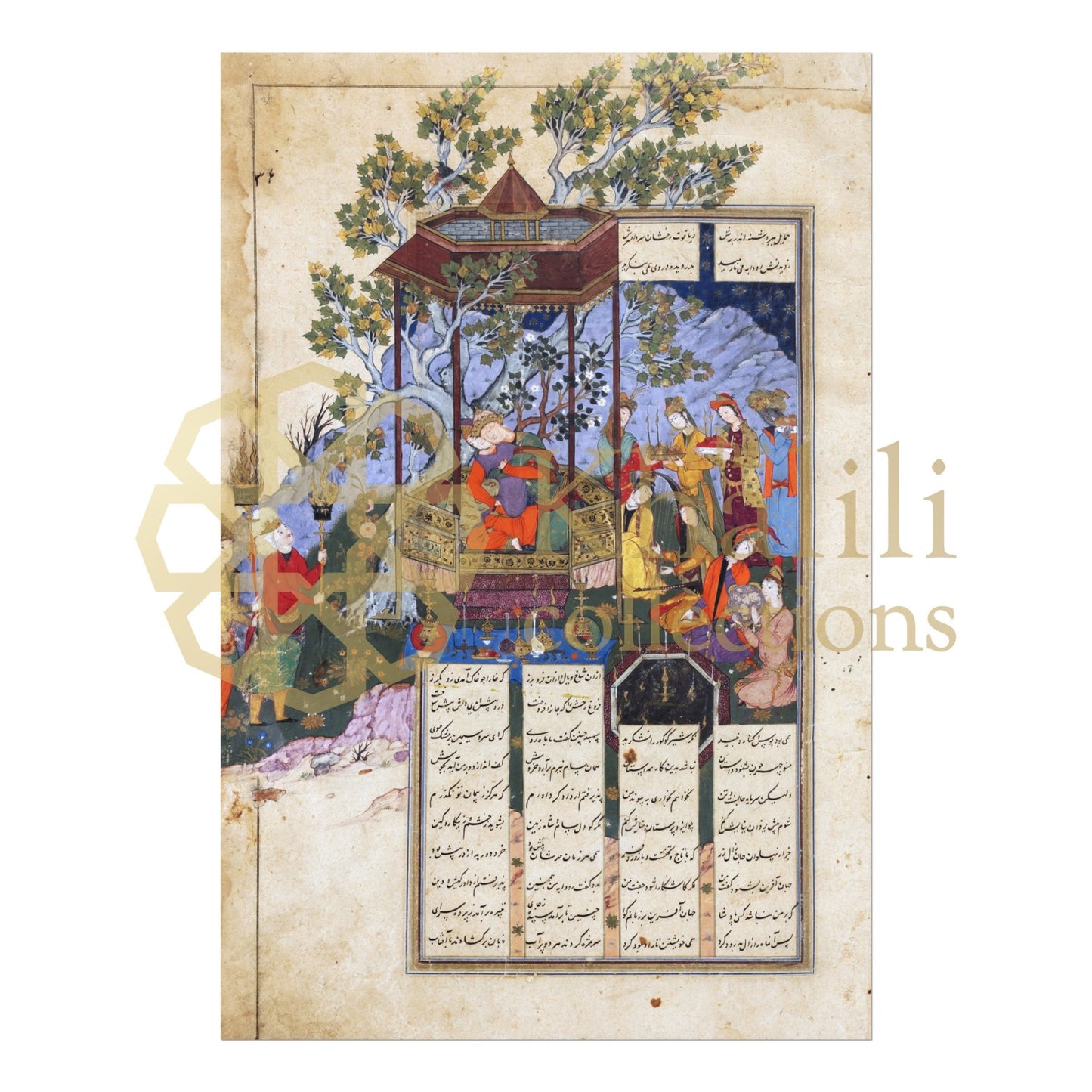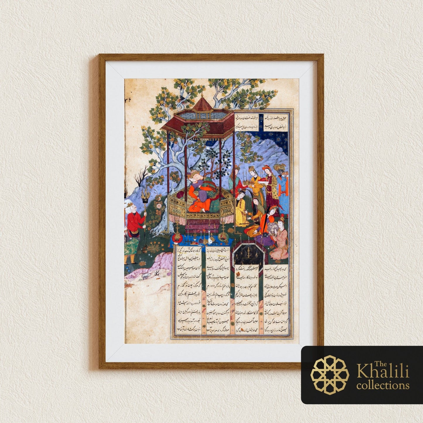 'Zal Meets Rudabah In Her Pavilion', a traditional Persian painting from Ferdawsi's epic book of kings, the Shahnameh. Available as an art print exclusively from Pathos Studio, in collaboration with The Khalili Collections.